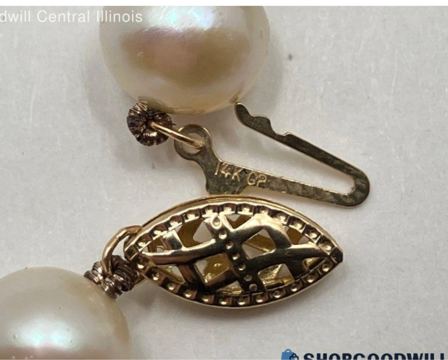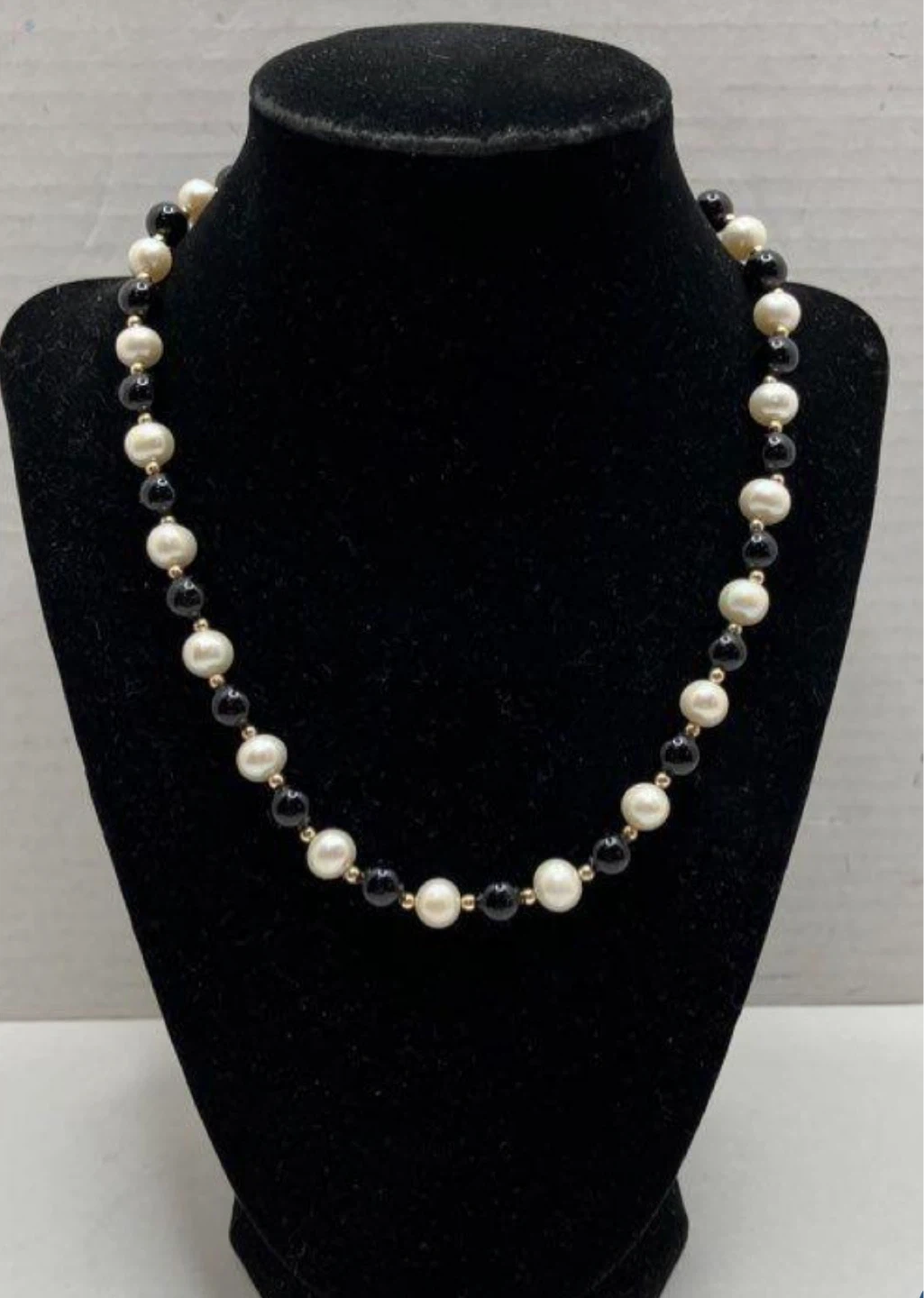 27This is a lovely beaded necklace featuring alternating pearls and black onyx beads. The clasp is marked "14K GP". It weighs 34.04 grams
