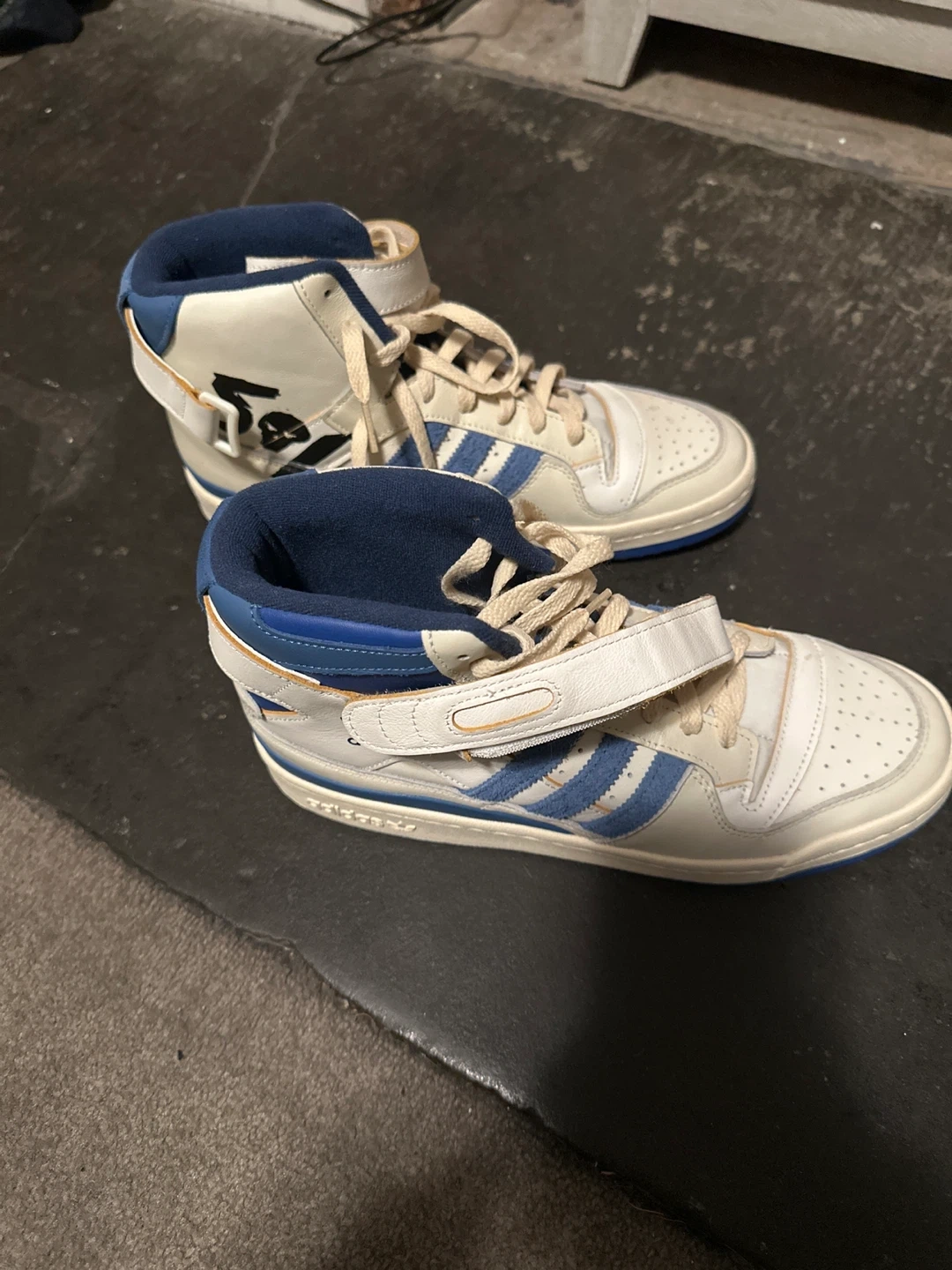 White and blue Adidas Forum 84 hi top sneakers. Leather and synthetic materials. Lace-up closure with an adjustable ankle strap.