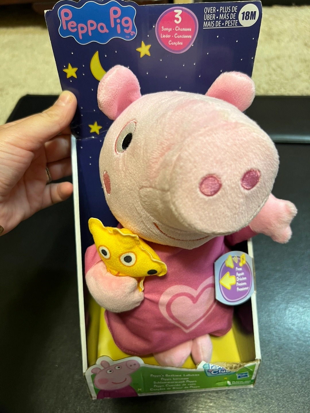 Selling a brand new Peppa Pig Bedtime Lullabies plush toy, still in its original box! This adorable Peppa Pig plush is perfect for little ones and plays 3 soothing lullabies to help them drift off to sleep. Recommended for ages 18 months and up, it's a great addition to any child's bedtime routine