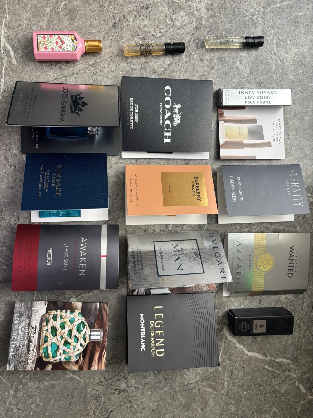 Selling a perfume samples from various designer brands. Great way to try out different scents before committing to a full bottle Includes brands like Gucci, Dolce & Gabbana, Versace, Coach, Burberry, Calvin Klein, Issey Miyake, Tumi, Bvlgari, Azzaro, Montblanc First pic just spray 1 time but second pic never spray Feel free to ask questions $5 per each Pick up only