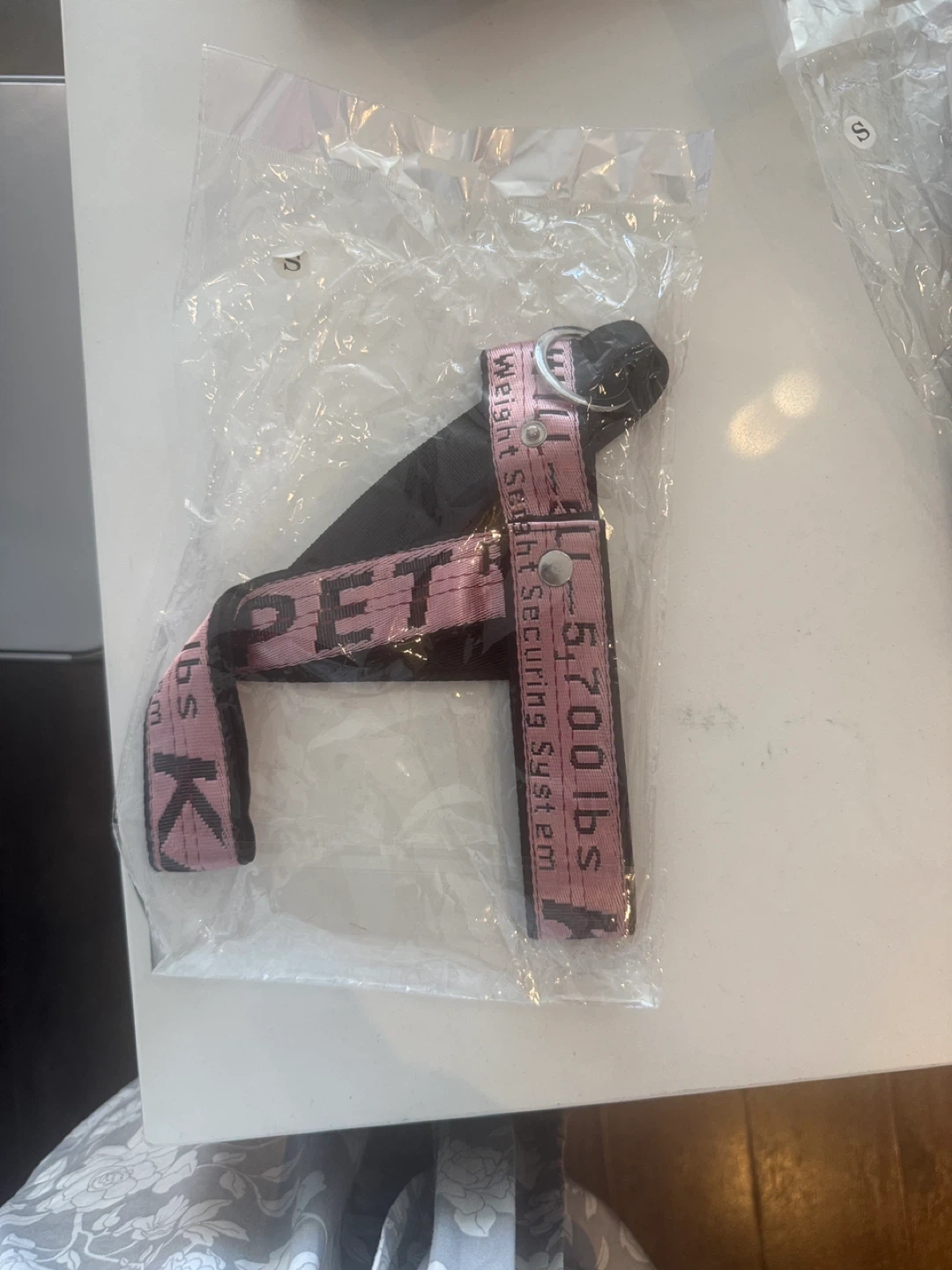 I'm selling a new pet harness and leash! It's perfect for keeping your furry friend safe and secure. The harness is designed after off-white, designer, replica. Available in pink and black. Both size small. Price is per set leash and harness.
