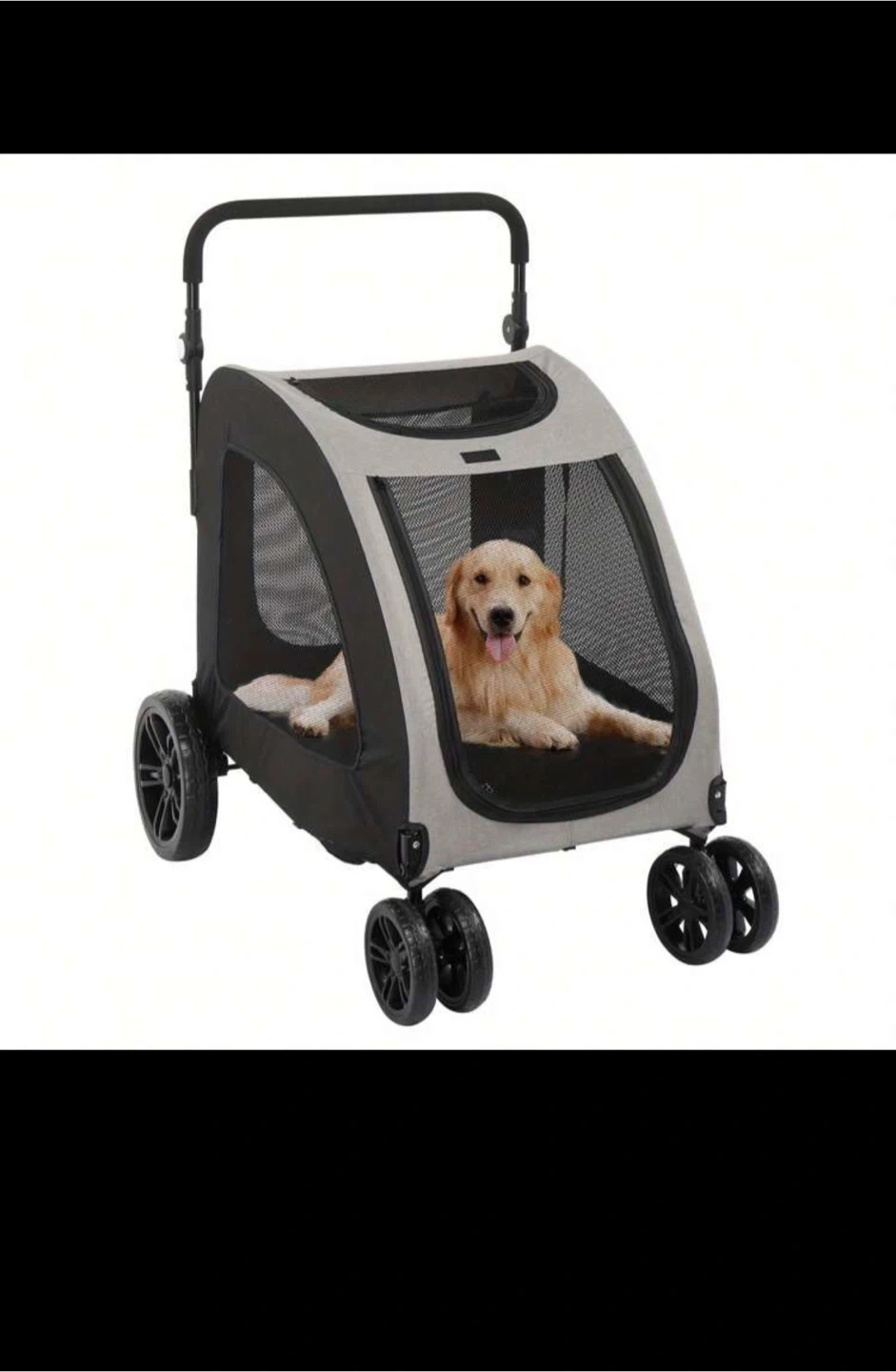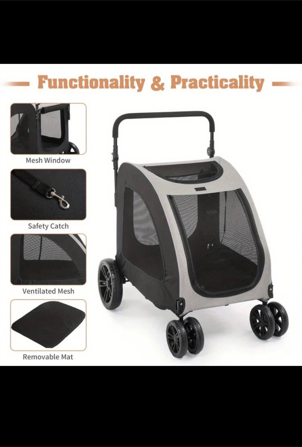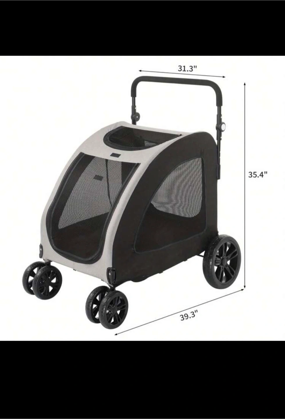 60This pet stroller is perfect for taking your furry friend on walks! It features a mesh window for ventilation and a safety catch to keep your pet secure. It also comes with a removable mat for easy cleaning. The dimensions are 31.3" x 35.4" x 39.3". The dog trolley new not used at all. Size is so big enough for Rottweiler two years old.
