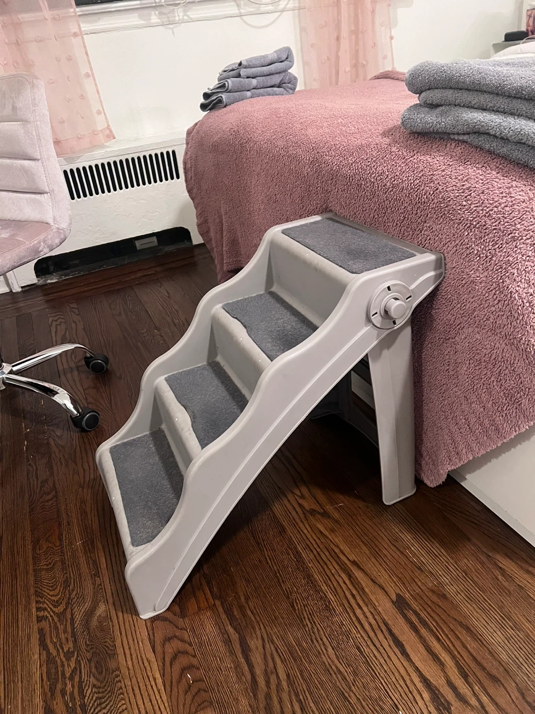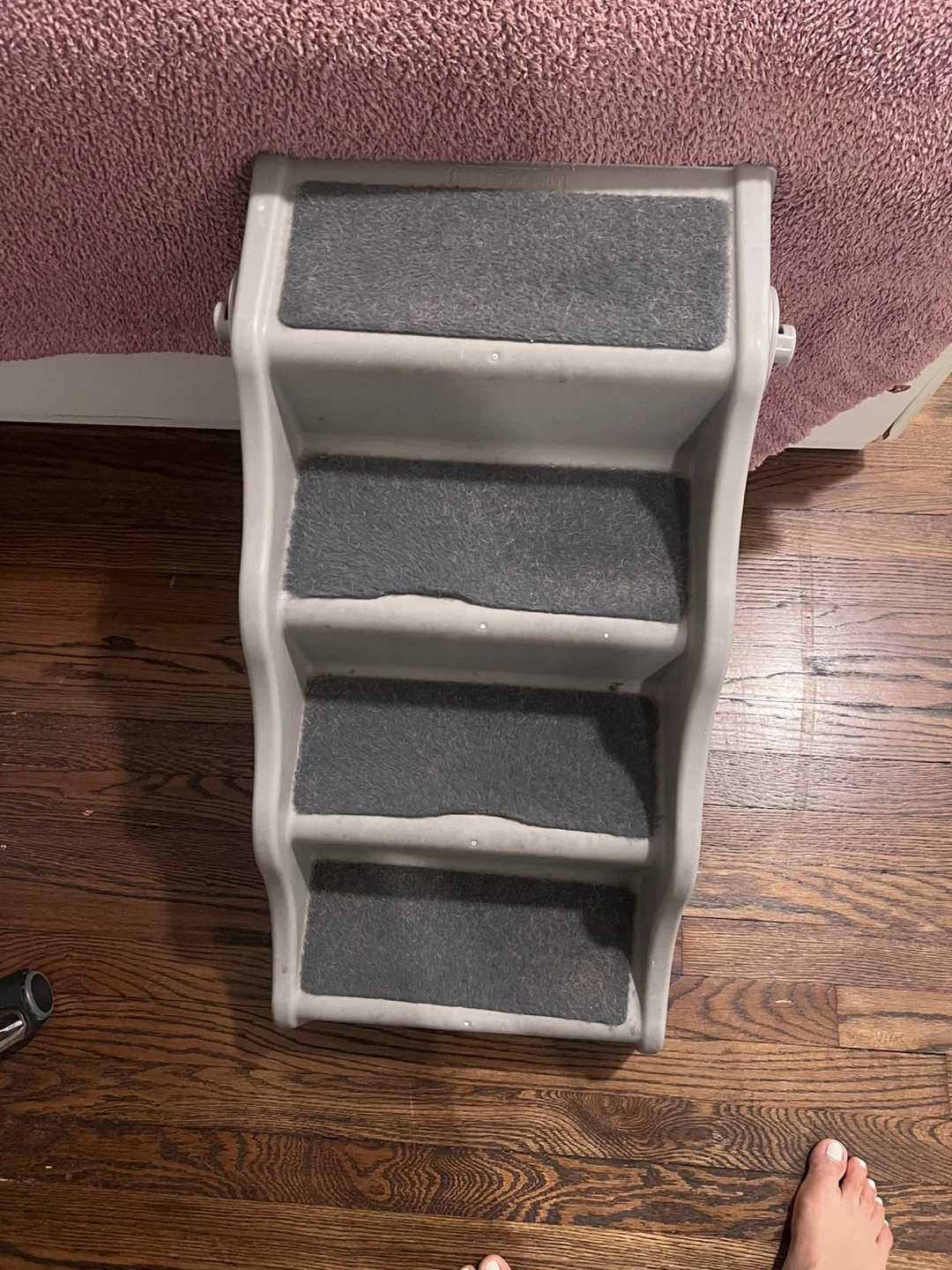 75These are PetSafe CozyUp Steps for your furry friends! They're in great condition and perfect for helping pets reach high places like beds or couches. The steps are gray and have a carpeted surface for better grip