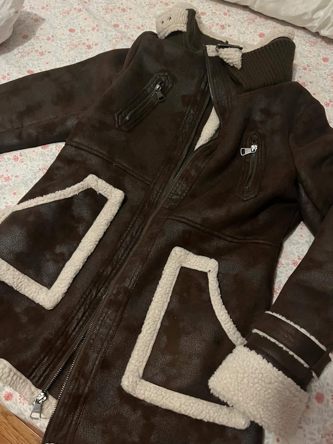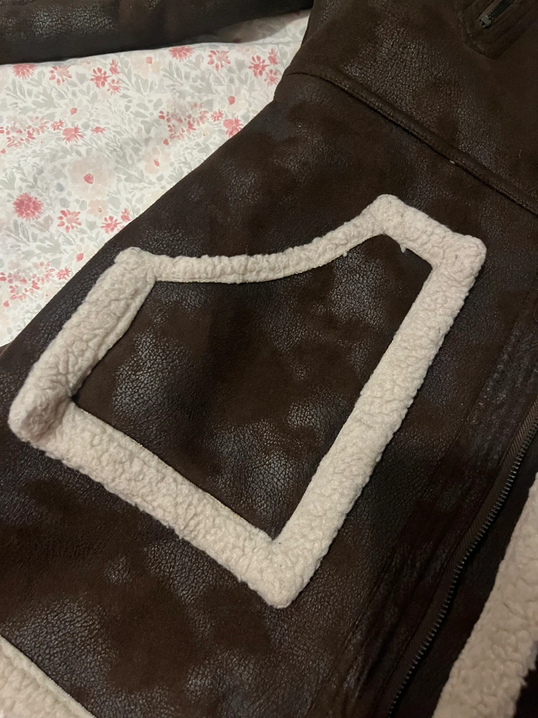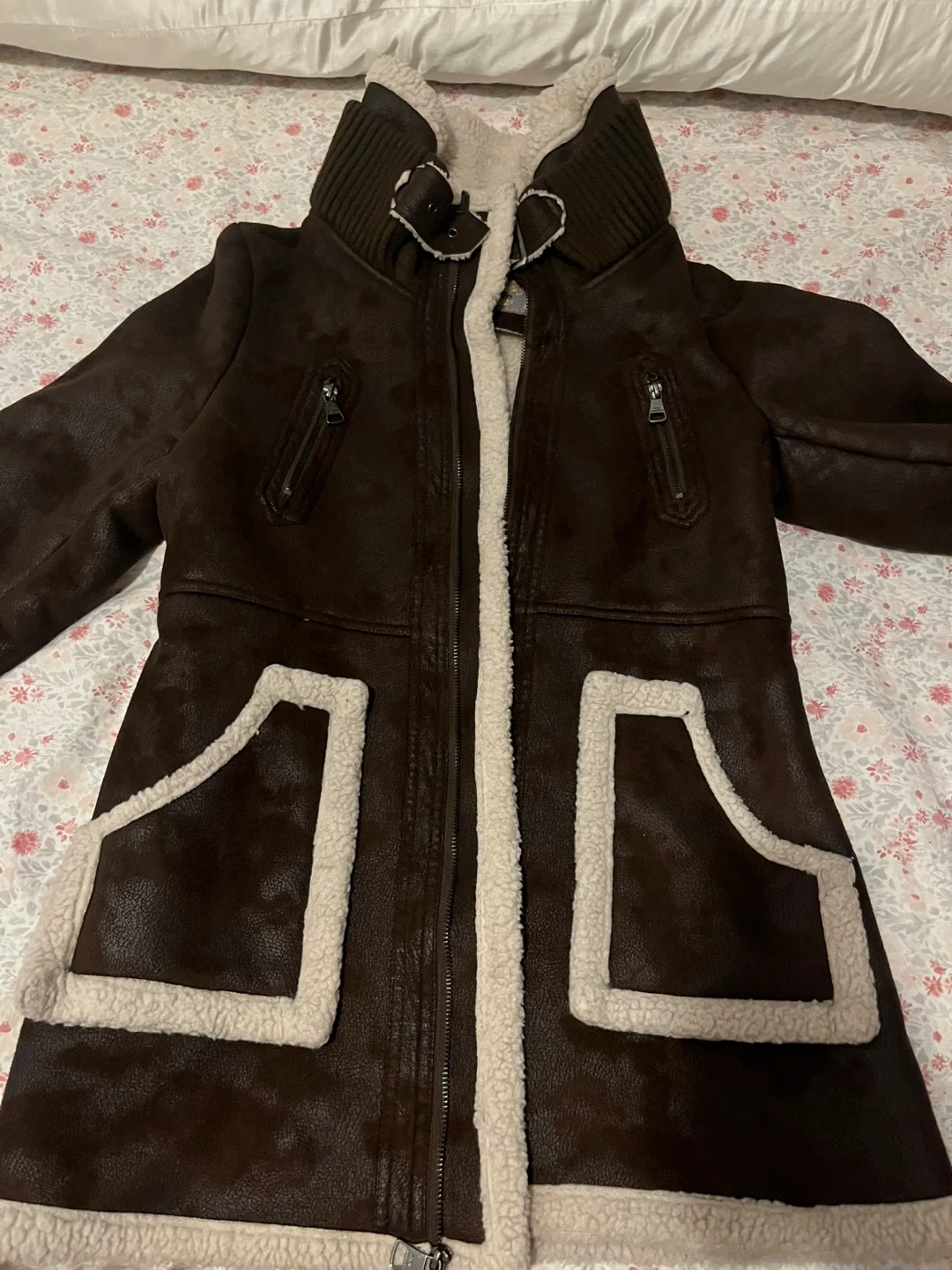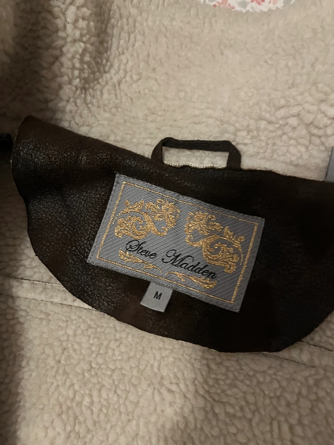 Selling a Steve Madden brown faux leather coat with shearling lining! It's a size M and in great condition. Perfect for staying warm and stylish during the colder months