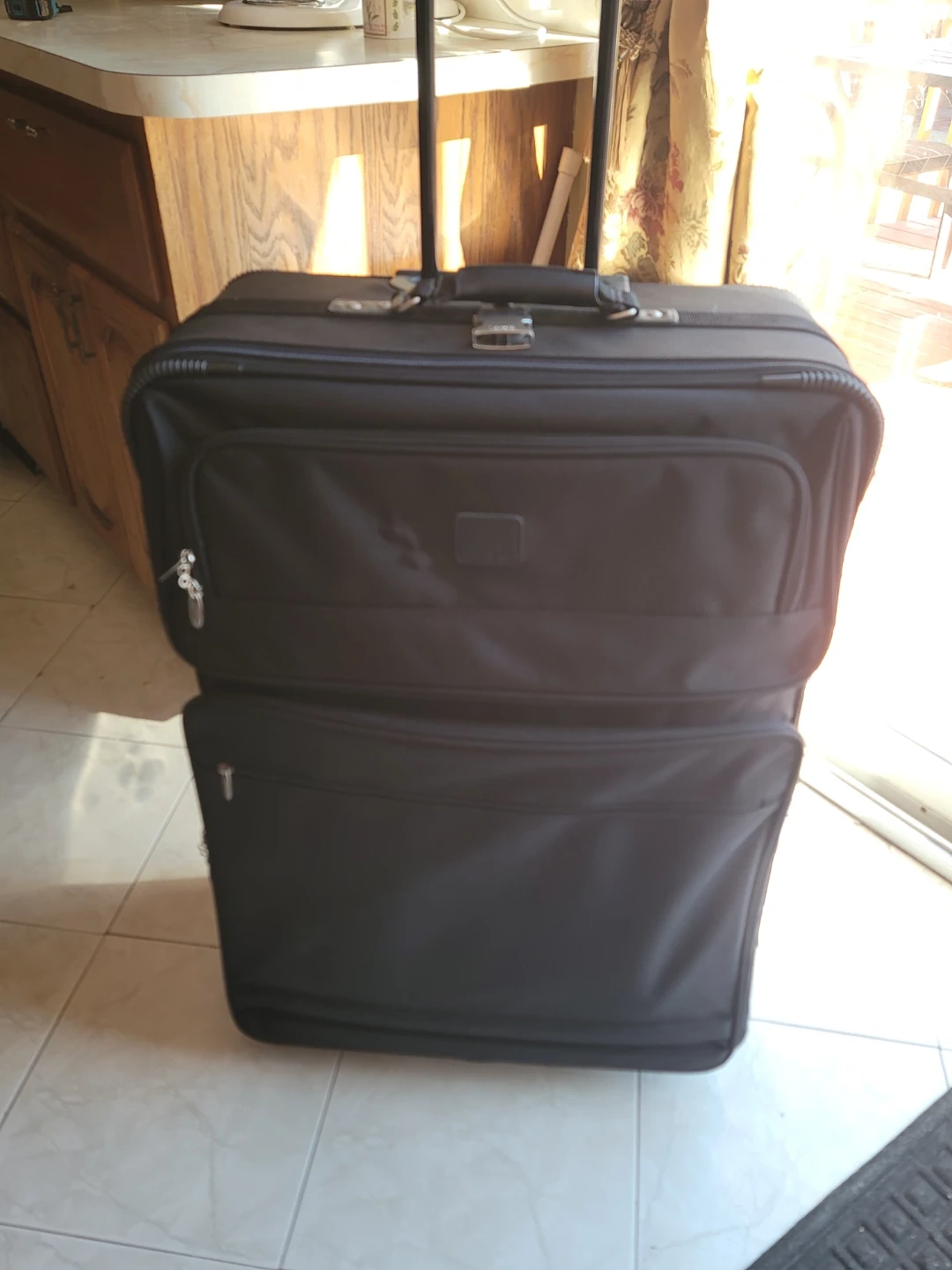 Black rolling suitcase with a retractable handle. Multiple exterior pockets. Durable construction.