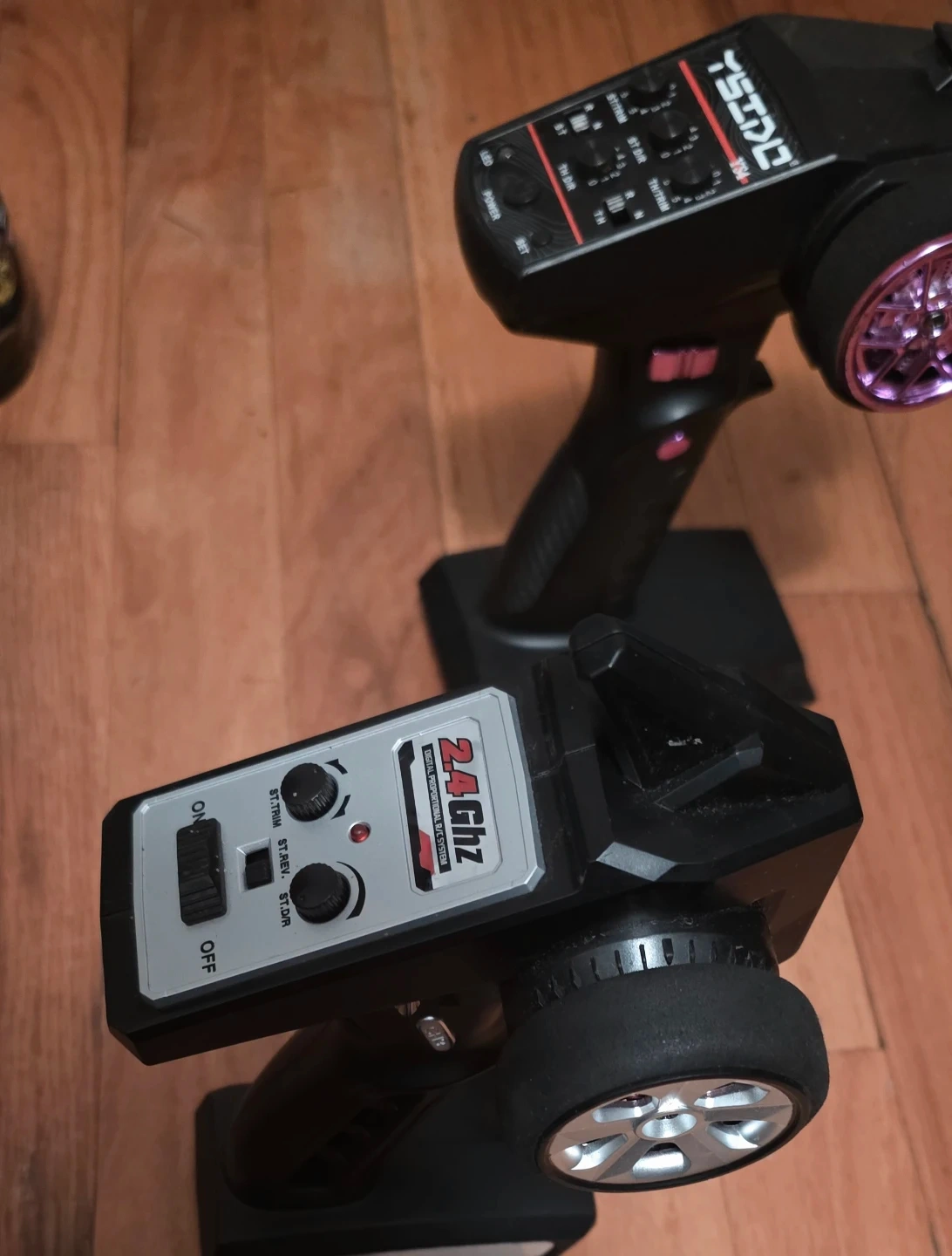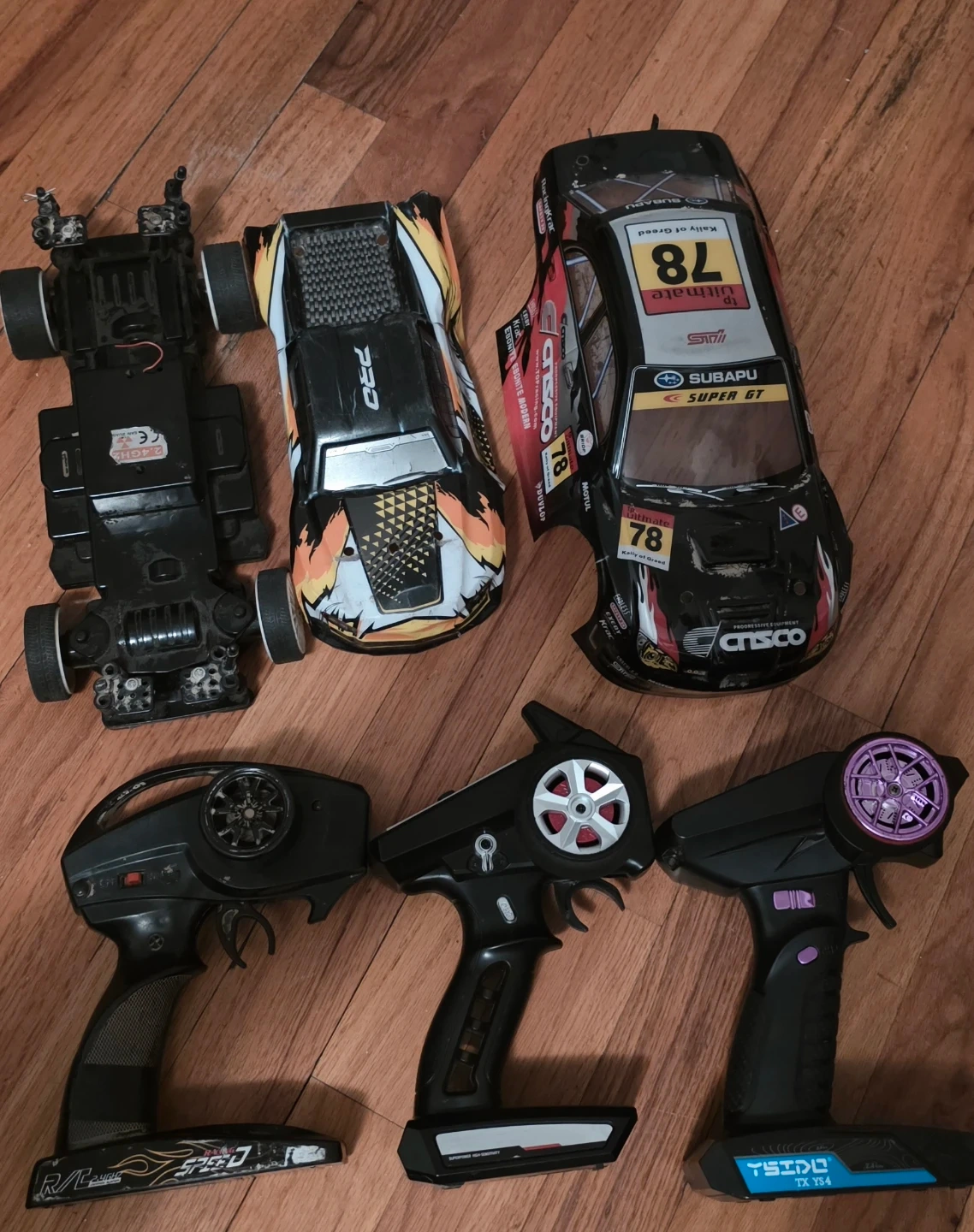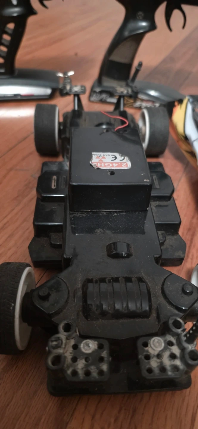 HI IM SELLING A RC PART LOT Set of three RC car remote controllers and three RC car bodies. One controller is labeled '2.4GHz'. The car bodies include racing designs and sponsor decals. Some wear present on controllers and bodies. Not sure if the car works untested selling it all for a low price