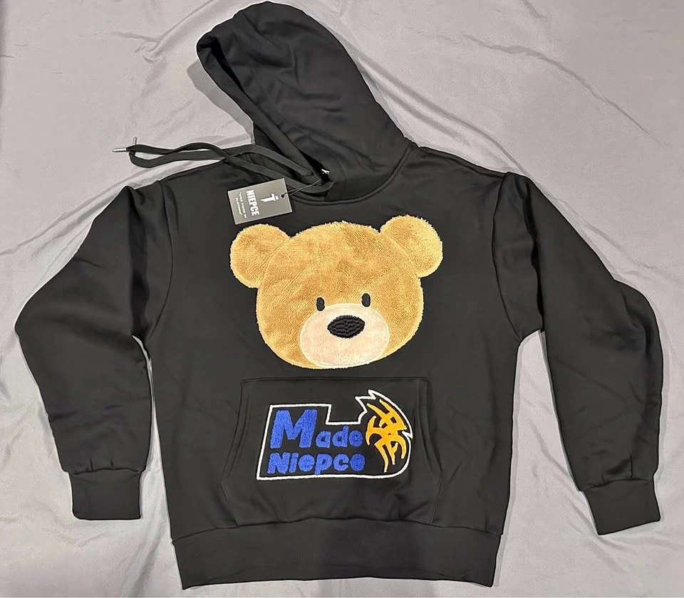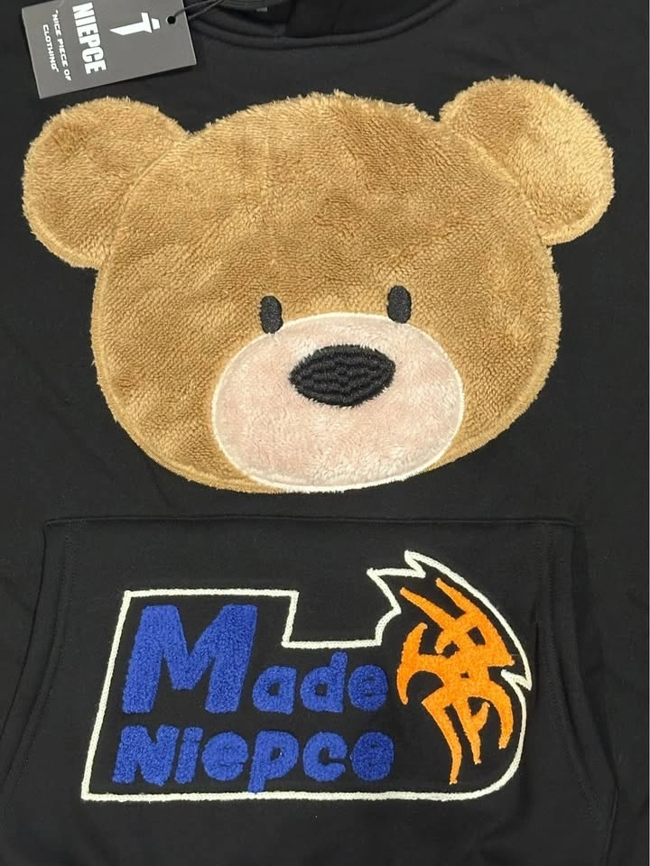 Furry teddy bear face and Made Niepce design. 3D furry patchwork printed design to imitate a real bear feeling. Designed to be relaxed fit and roomy. Machine Wash Cold, Gentle Cycle. Tumble Dry Low. Low Iron If Needed. Mesh fabric cotton and polyester blend material with breathable fabric for all season comfort wear.