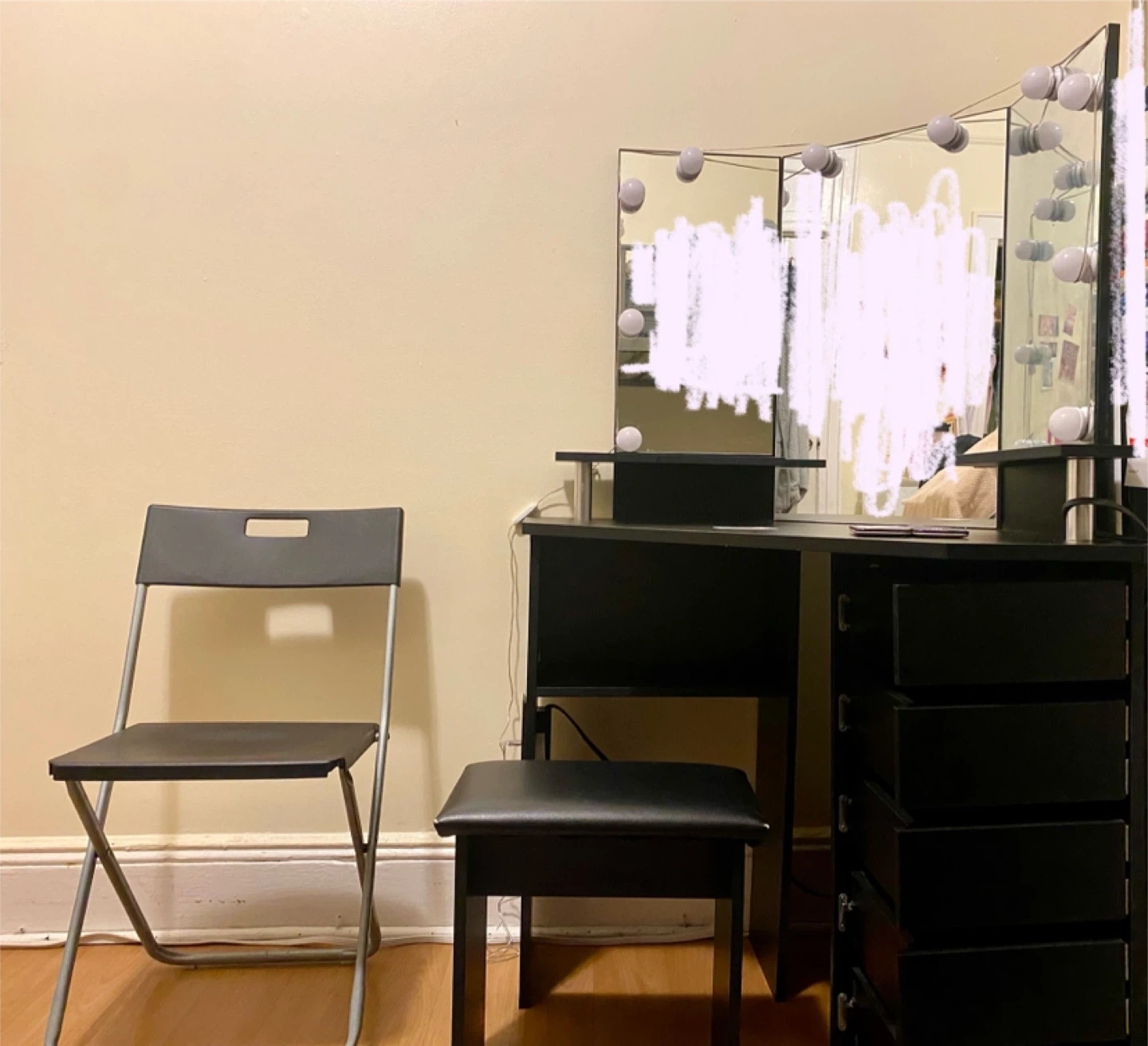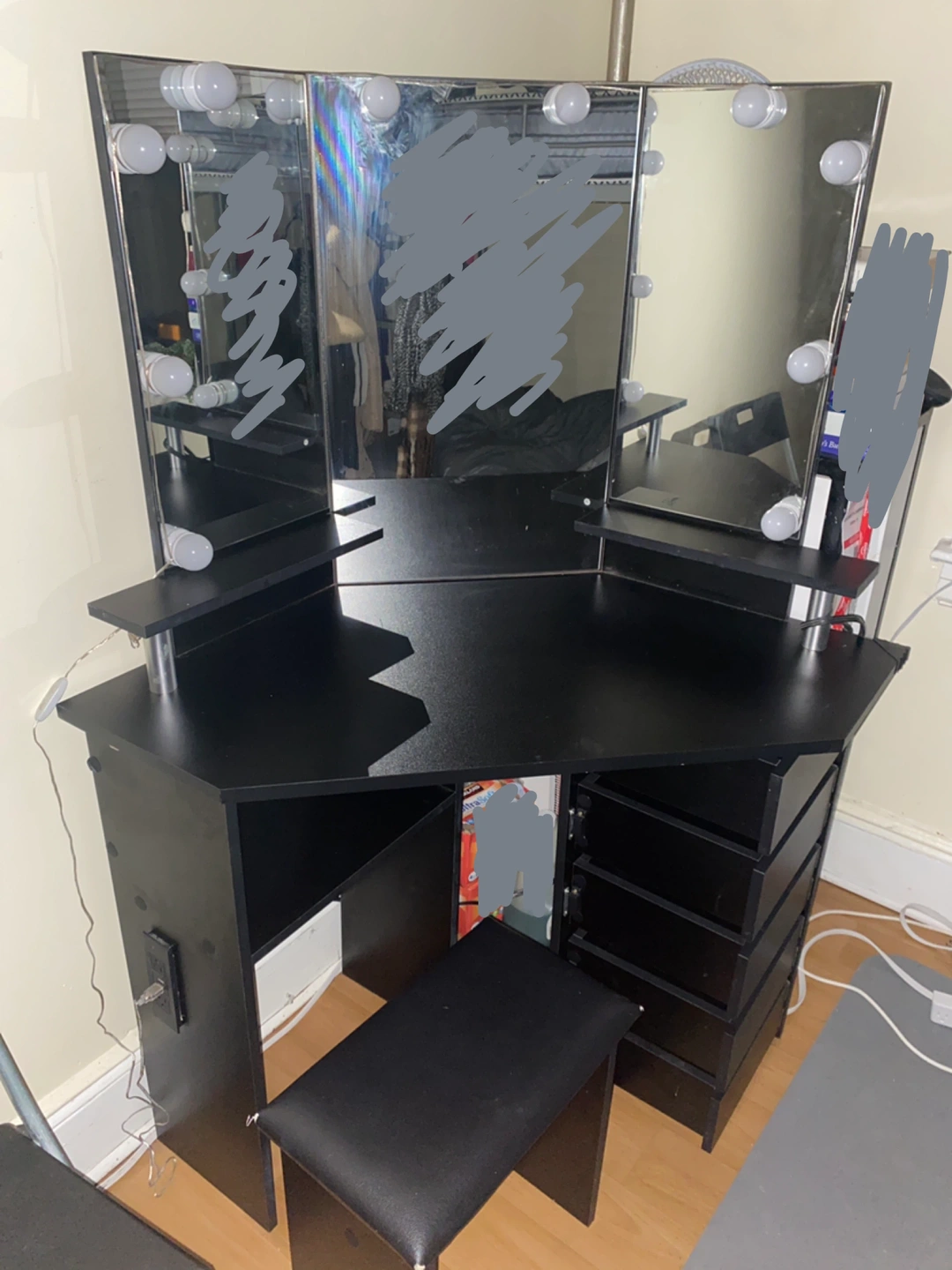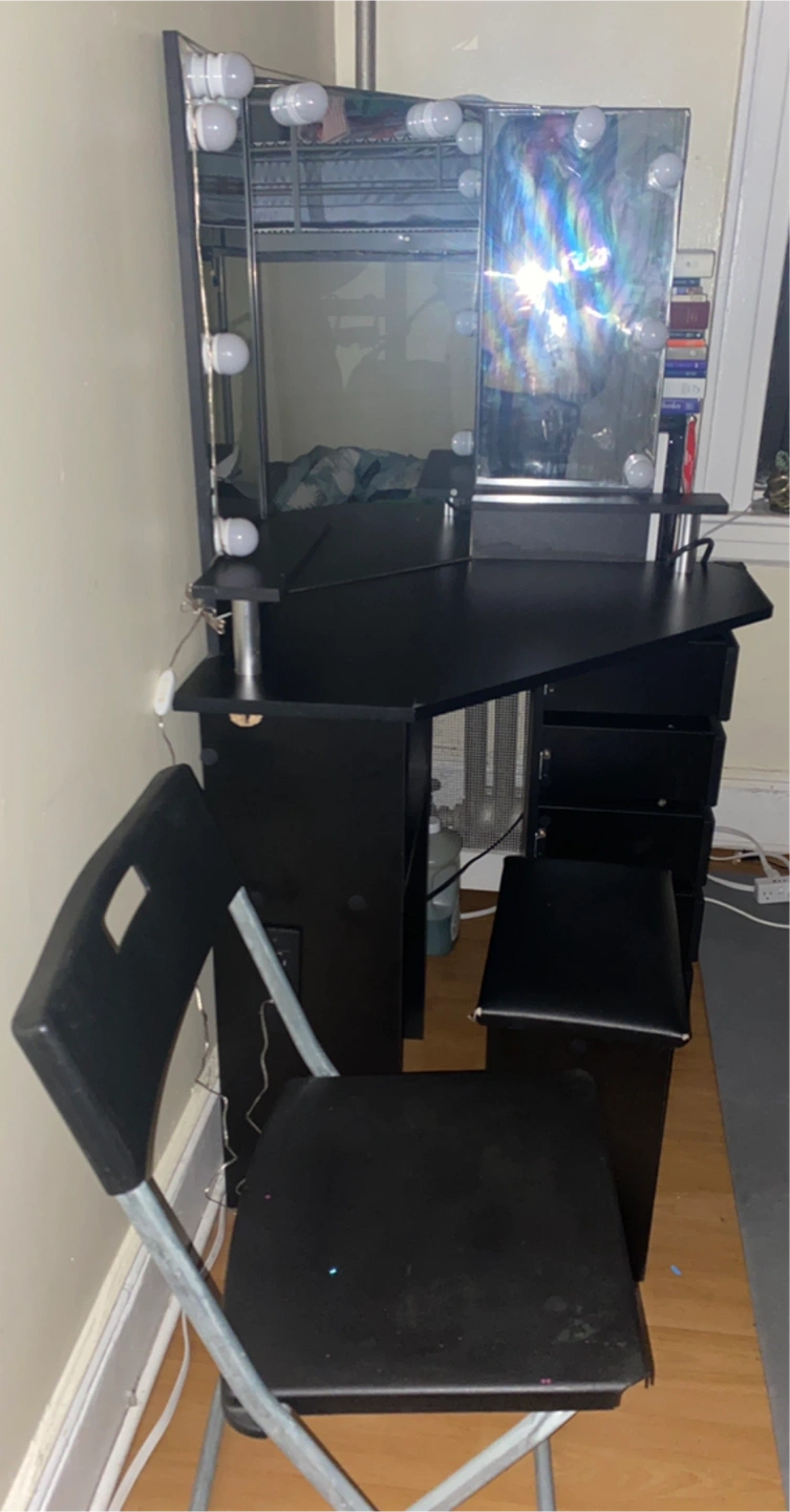 Black beauty desk with a plug and a chair included. Feel free to message if you have any questions!