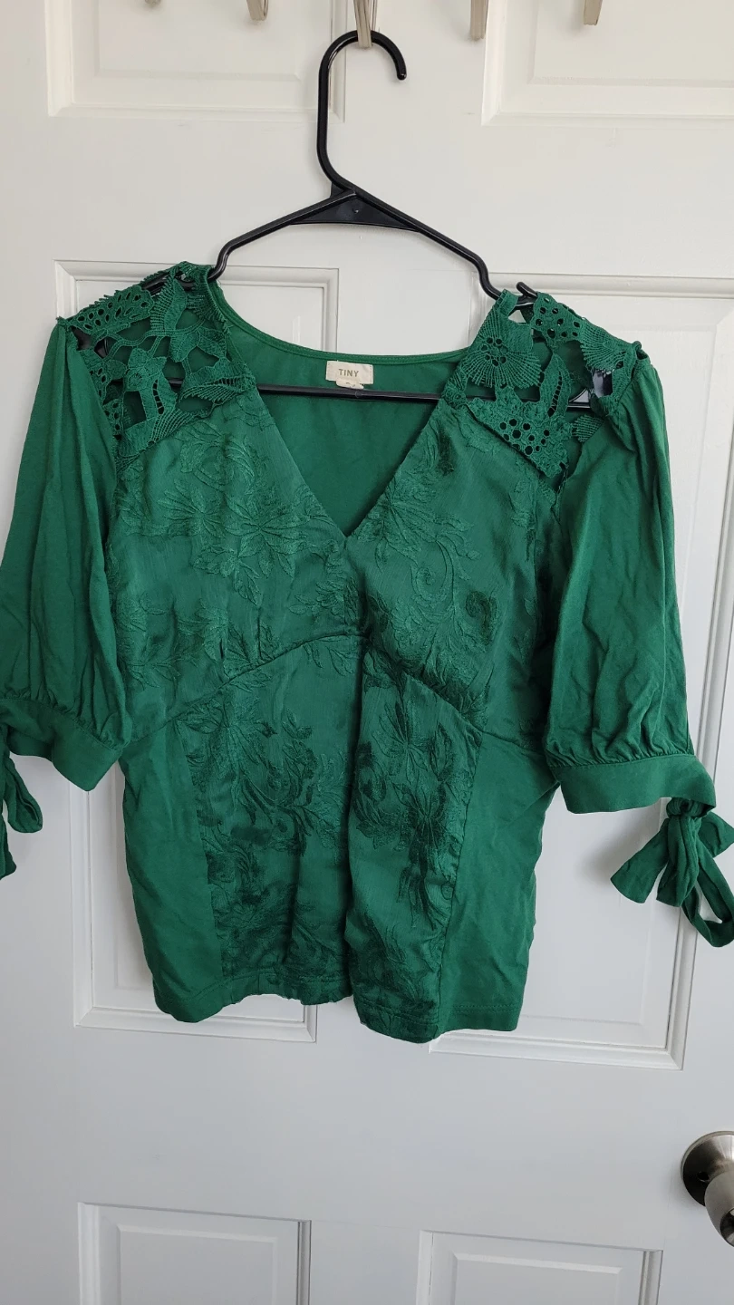 This V-neck top features intricate green embroidery and delicate lace details on the shoulders. It has tie details at the sleeves. The fabric appears to be a satin or silk-like material.