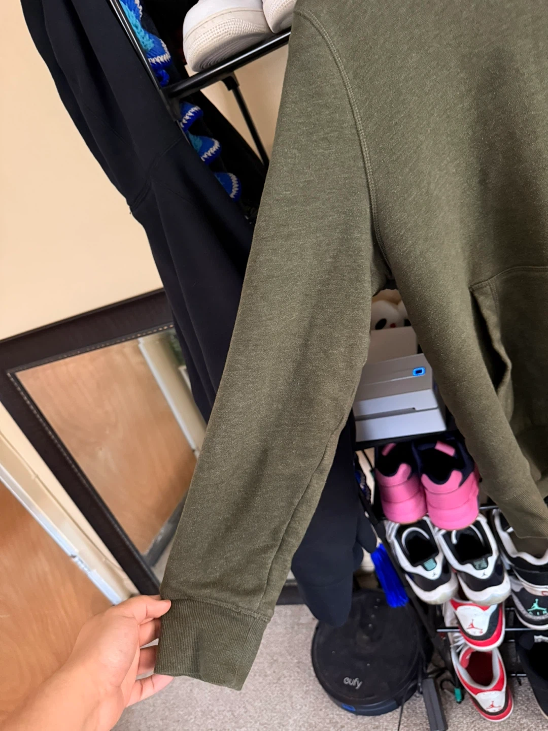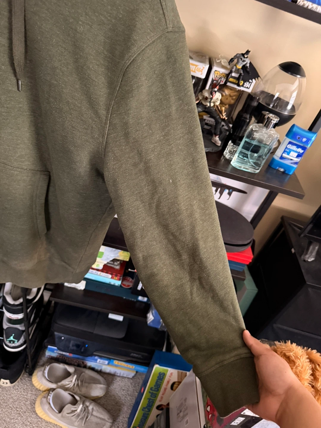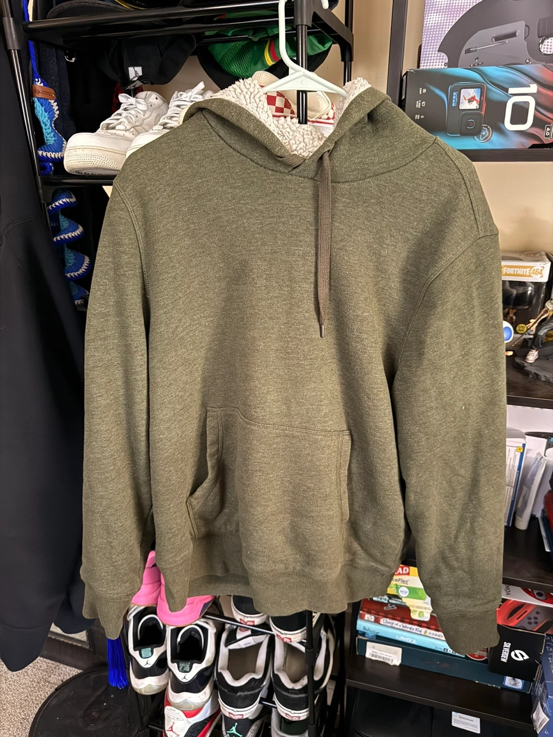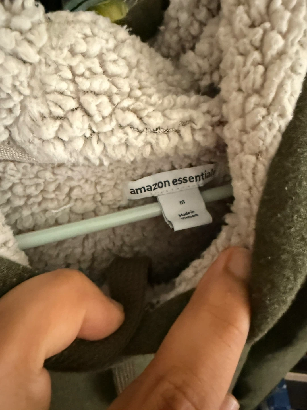 Amazon Essentials sherpa-lined hoodie in olive green. It's a size medium with a cozy sherpa lining. The hoodie includes a front pocket and adjustable drawstring hood.