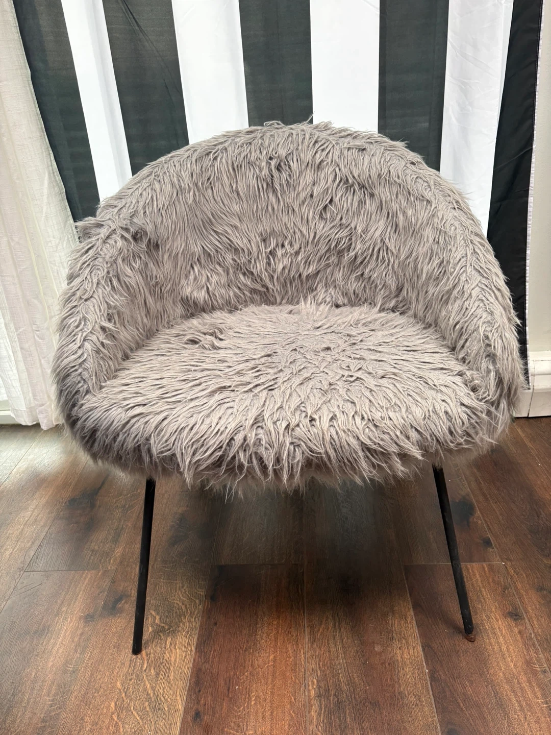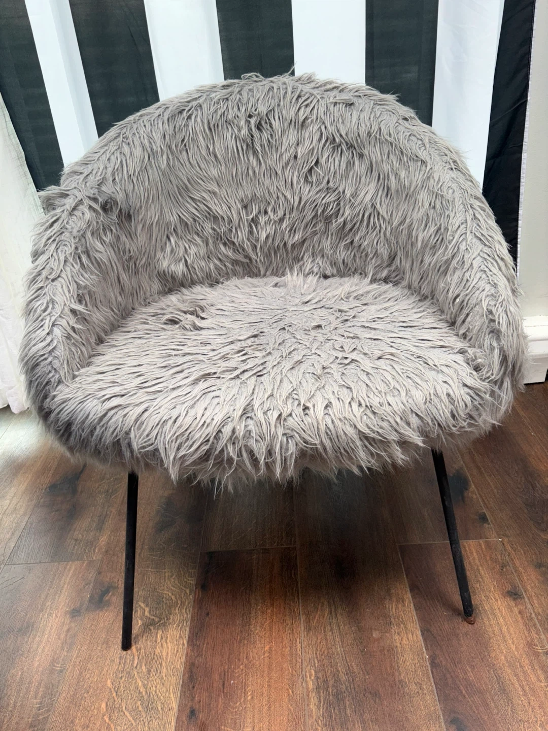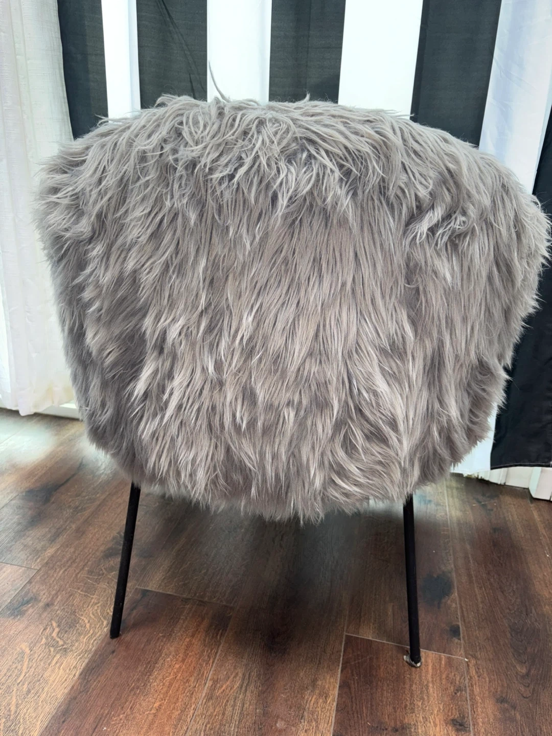 This cozy accent chair features a soft gray faux fur upholstery and a comfortable, curved silhouette. It's supported by sturdy black metal legs for a modern touch. The chair's unique texture and design make it a stylish addition to any room!