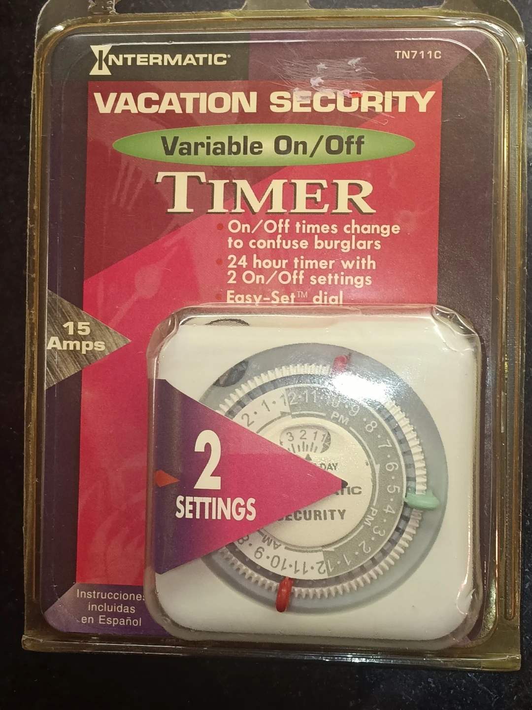 This Intermatic Vacation Security Timer helps to confuse burglars with variable on/off times. It plugs directly into any wall outlet and features a heavy duty load capacity. Rated capacity is 15 Amps 'R' Resistive, 1750 Watts 'T' Tungsten, and 1/3 H.P. It operates on 125 Volts AC, 60 Hz.