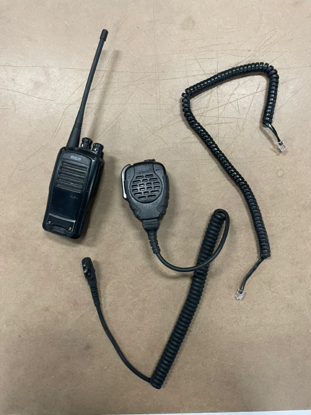 This is an RCA two-way radio. It comes with a speaker microphone and coiled cable. The radio is black and has an antenna.