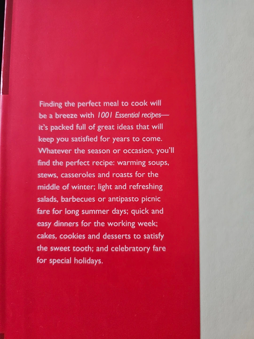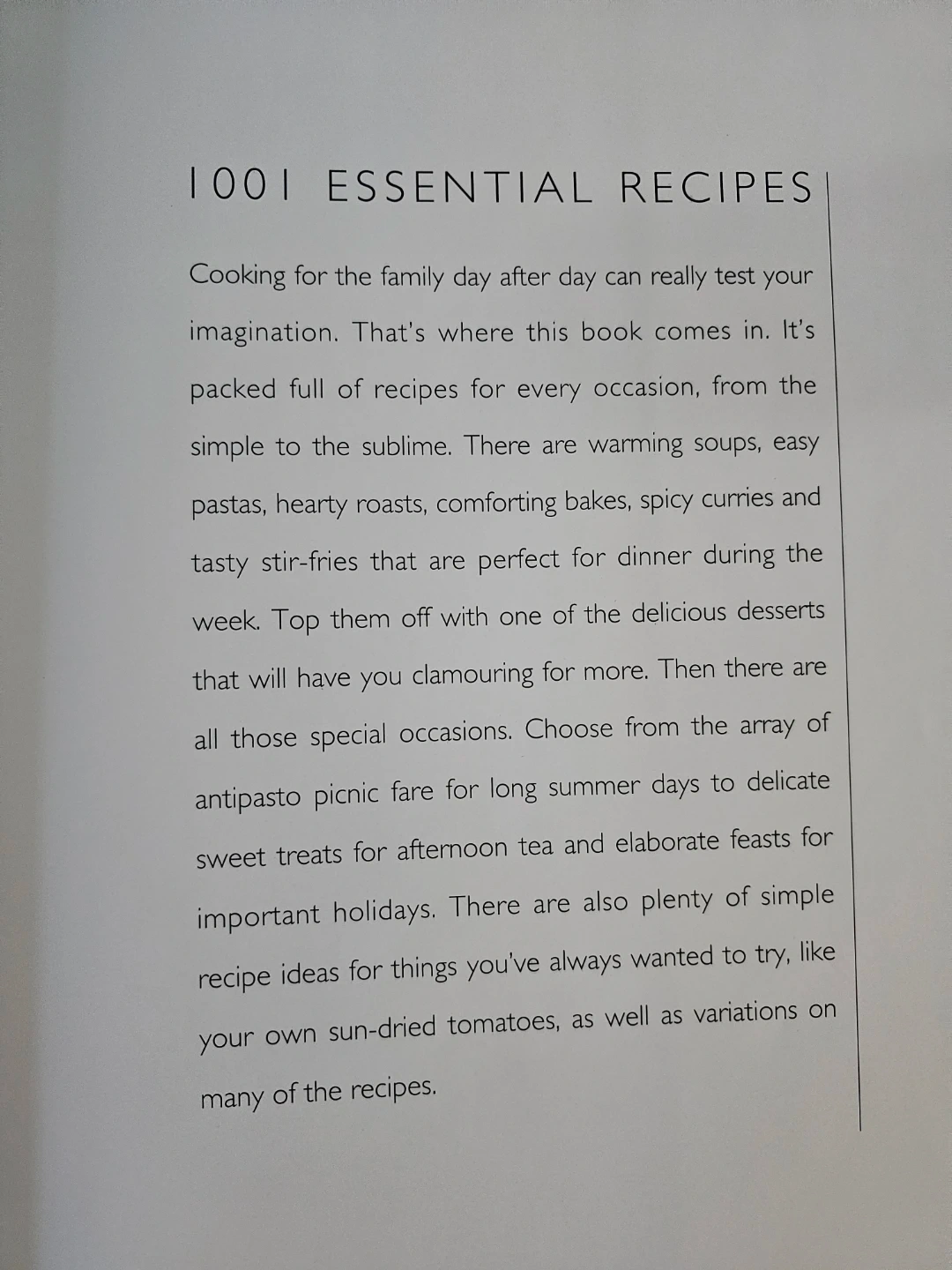 I'm selling a copy of "1001 Essential Recipes" cookbook. It's packed full of great ideas that will keep you satisfied for years to come! Finding the perfect meal to cook will be a breeze with warming soups, stews, casseroles and roasts for the middle of winter; light and refreshing salads, barbeques or antipasto picnic fare for long summer days; quick and easy dinners for the working week; cakes, cookies and desserts to satisfy the sweet tooth; and celebratory fare for special holidays
