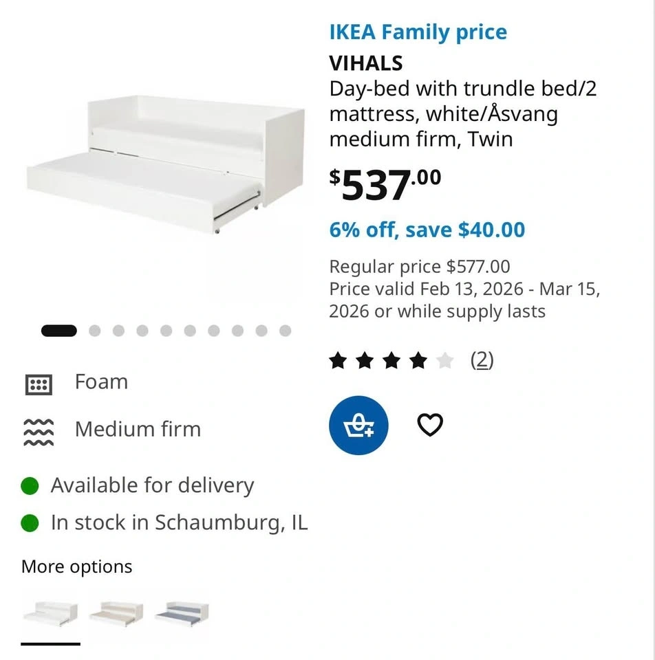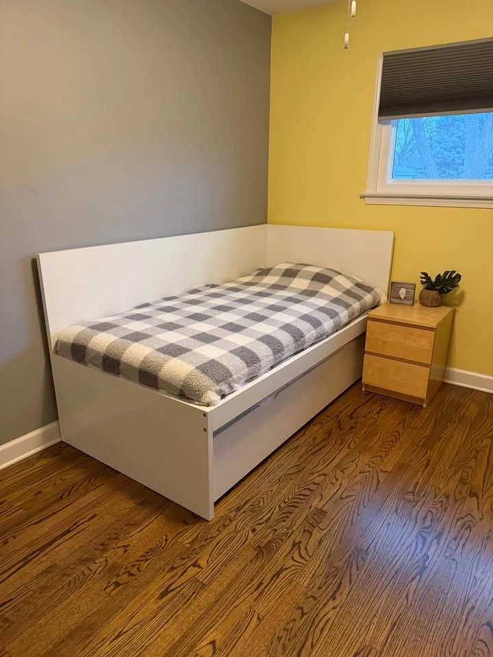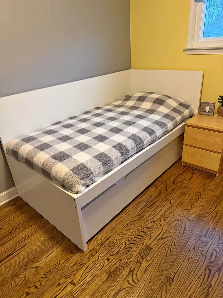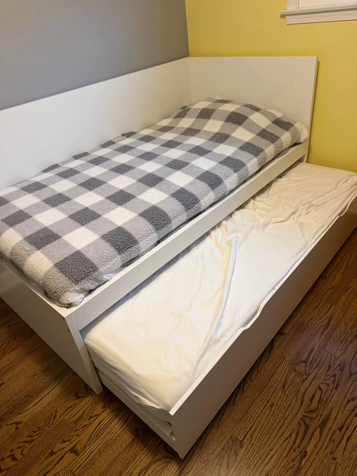 IKEA trundle bed frame and mattresses. Retail price $577. Dimensions: 41” wide, 79” long. Mattress height 24”. Headboard height 39.5” (covers two sides). Barely used, perfect condition, from a guest bedroom. Pick up in Mount Prospect, IL.