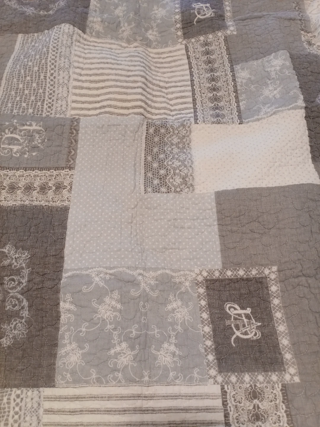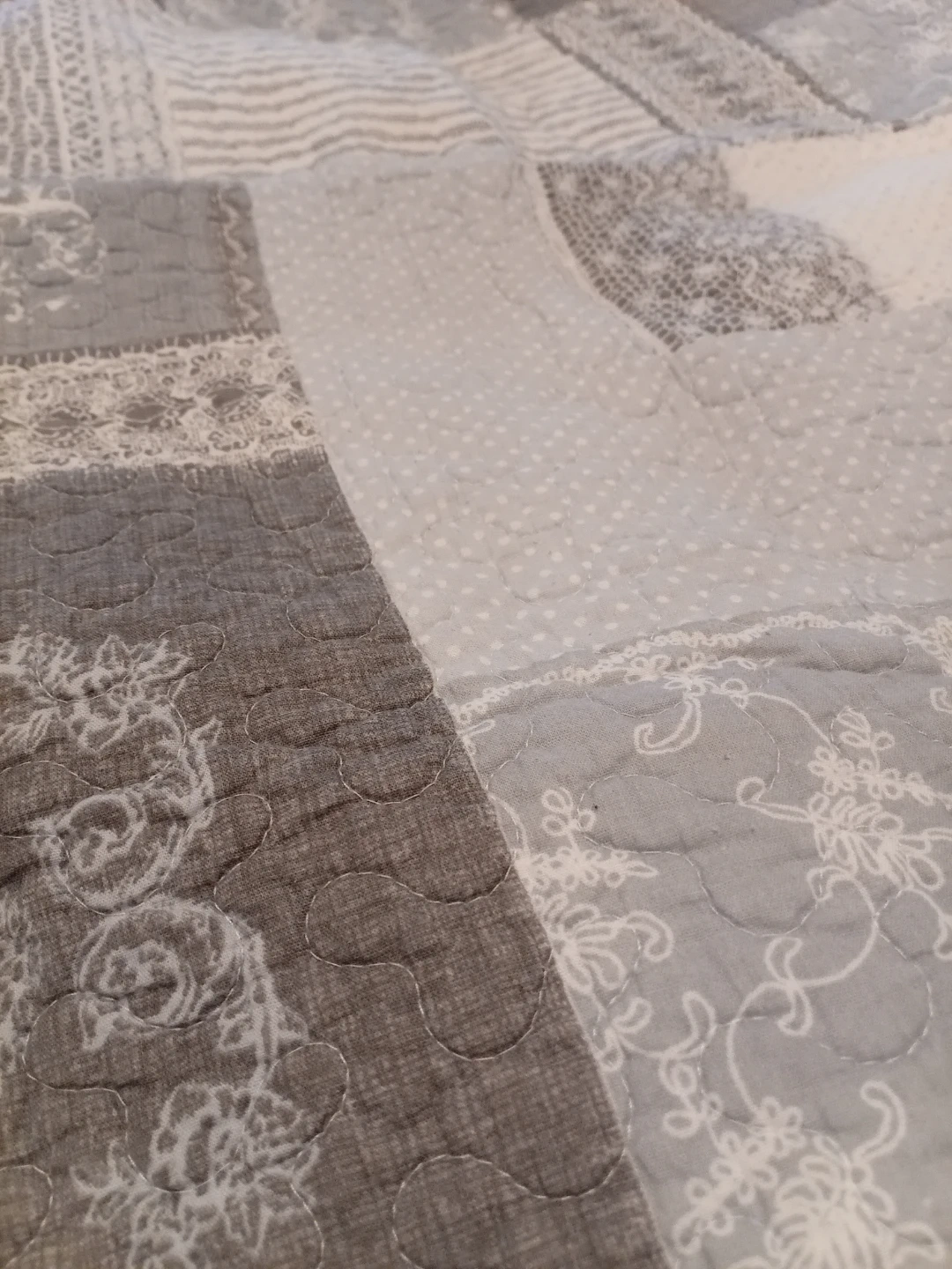 This is a lovely patchwork quilt set featuring a calming grey and white colour palette. It has a soft texture with various fabric patterns stitched together. It's a great way to add a cozy and decorative touch to your bedroom!