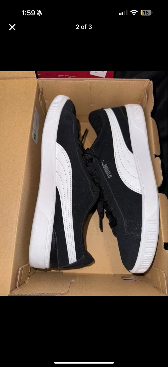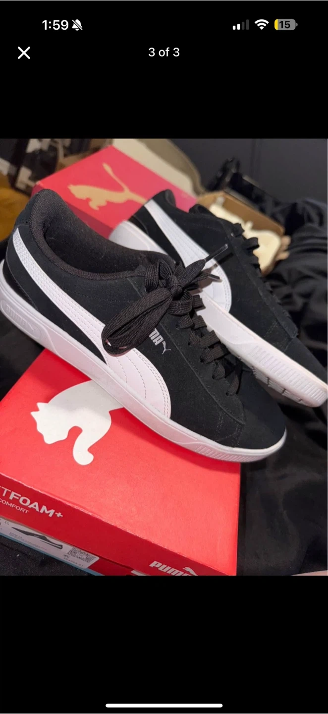 Selling a pair of Puma Vikky v3 shoes in black and white! They are women's size US 8.5 and come with the original box. These stylish sneakers are perfect for everyday wear and are in great condition