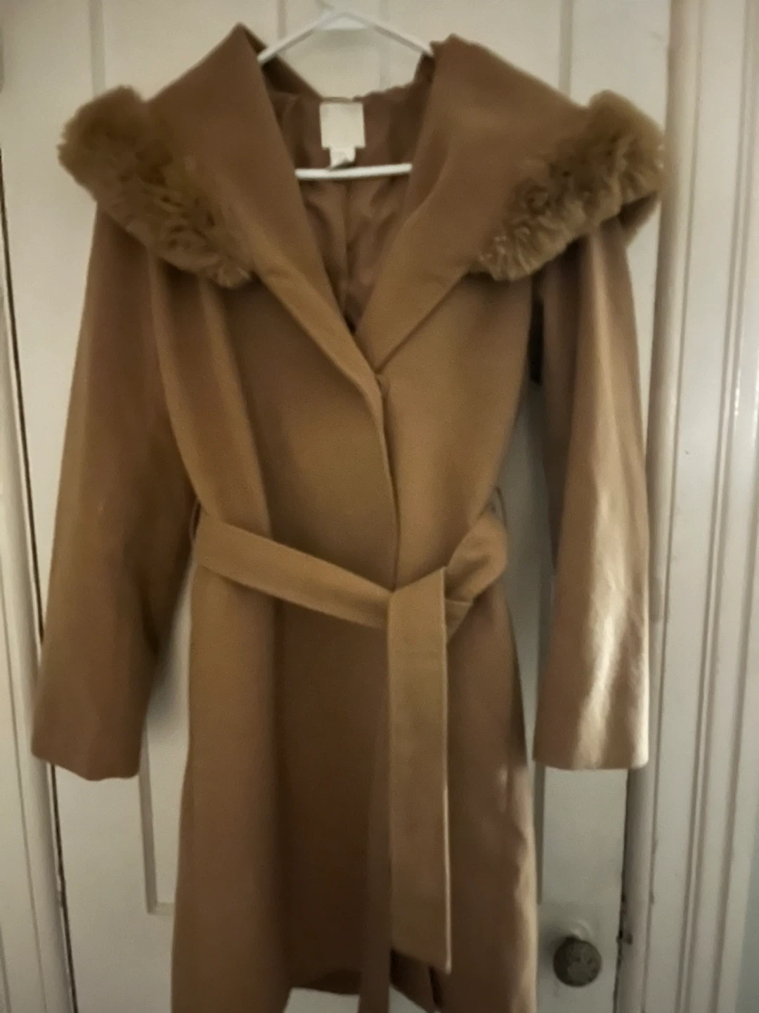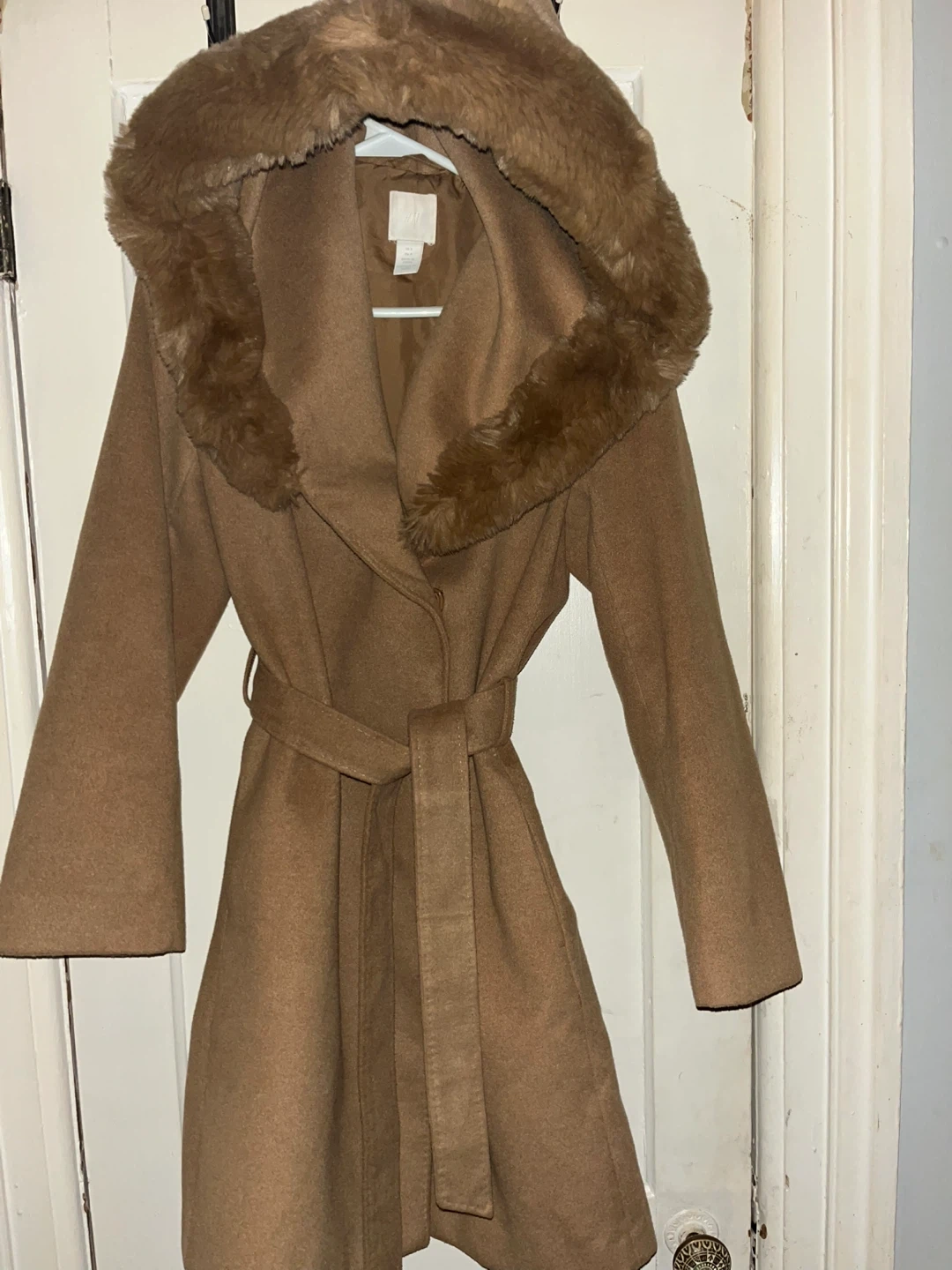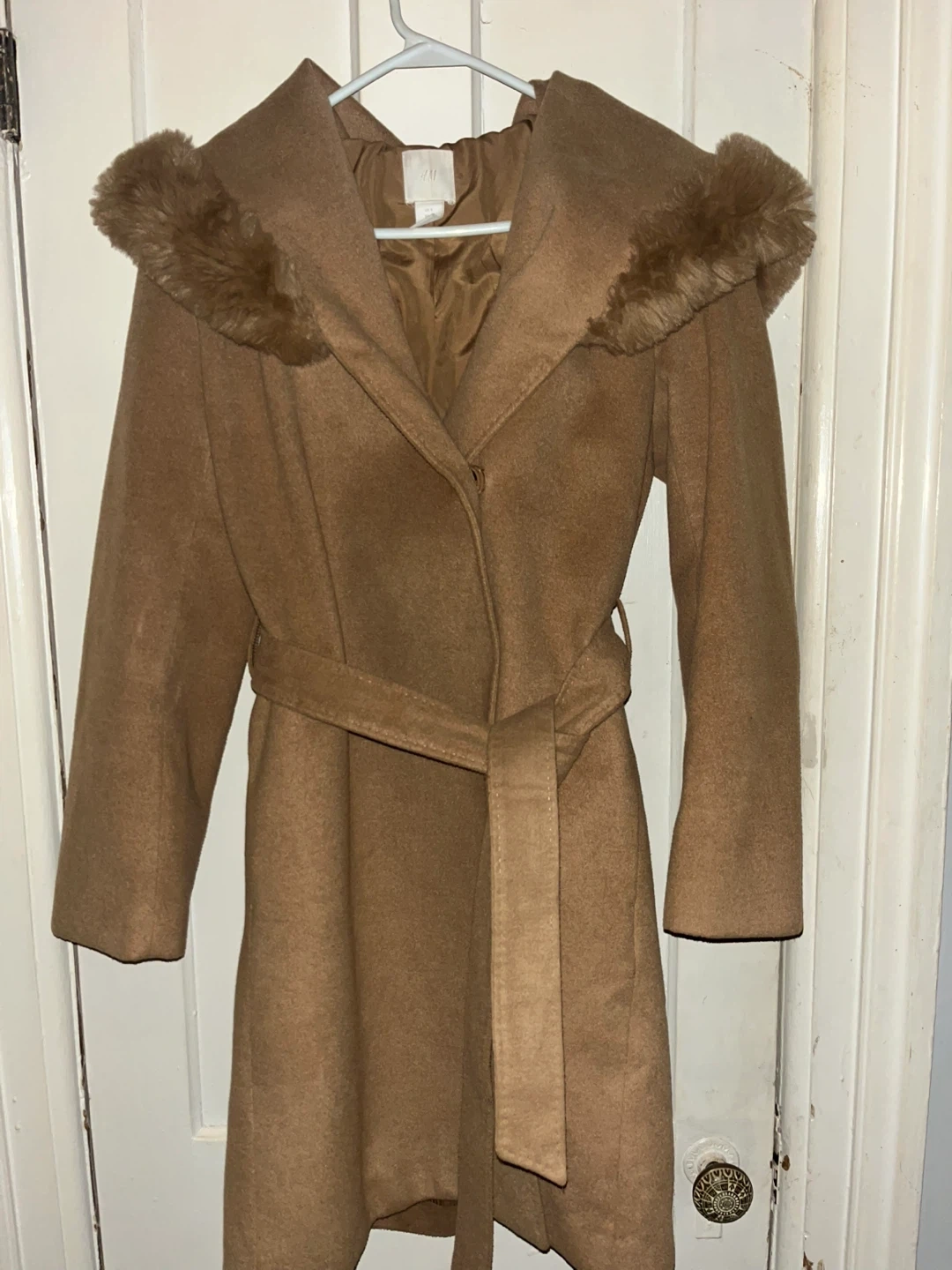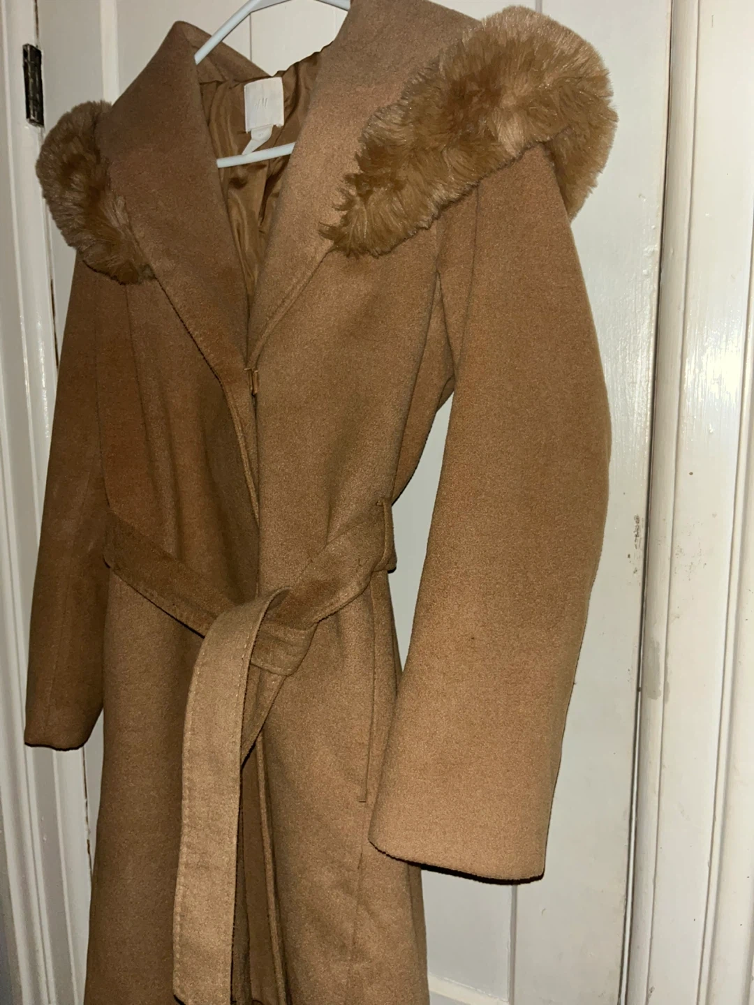 This H&M coat is a stylish camel colour and features a cozy fur-trimmed hood. It comes with a matching belt for a cinched waist. A great choice for chilly weather!