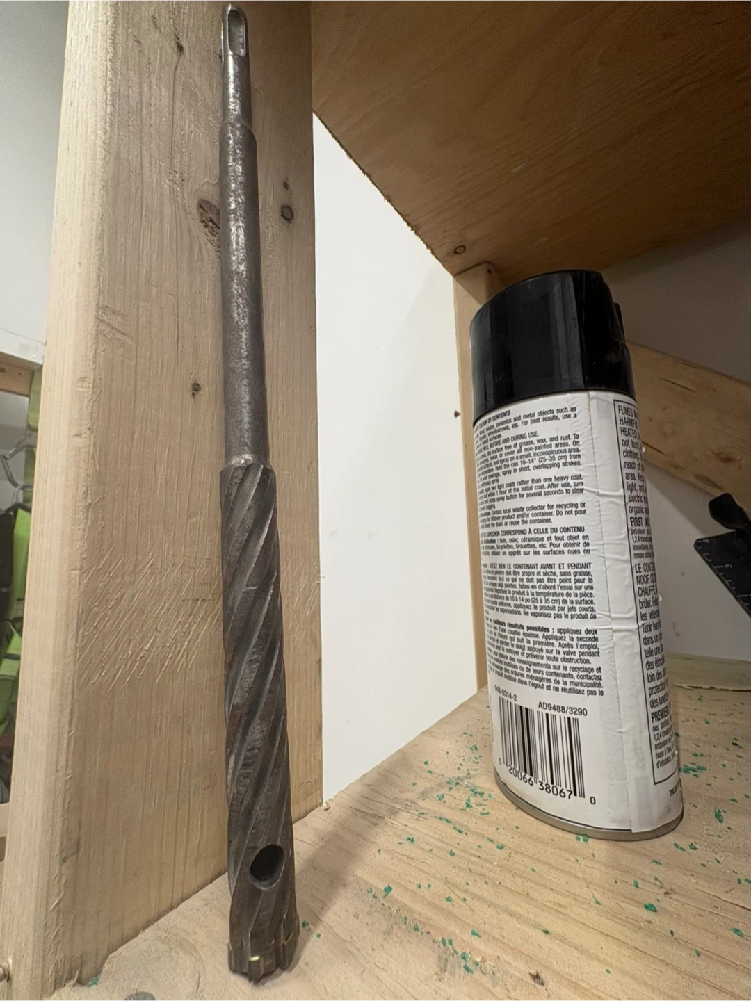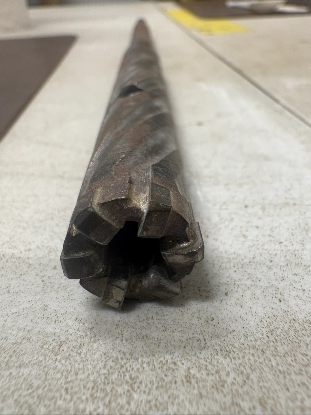 Used rotary hammer drill bit with a SDS-Plus shank. It's designed for drilling into concrete and masonry. The fluted design helps with dust removal during operation. 12 inches by 5/8 diameters