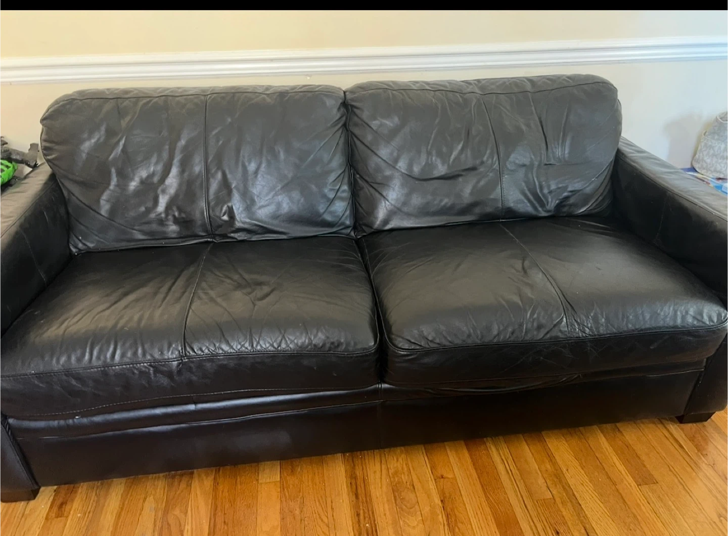 Buy & SellBlack Leather SofaBlack Leather Sofa$162Black leather sofa. Two cushion seats. Minor wear and small taped repairs visible on the seat cushions. Mid condition pick up onlyConditionOkayWHERE TO MEETCheck LocationView MapSELLERJessiWoodhaven200 reviews0 chats·0 favorites·11 viewsSEND CHAT TO SELLERHi Jessi! I’m interested in your listing.Hi Jessi! I’m interested in your listing.Get the Karrot app to chatSign In to chat