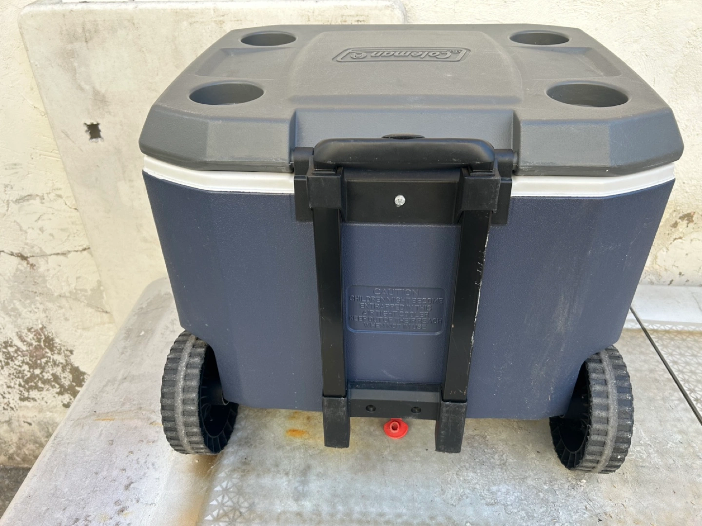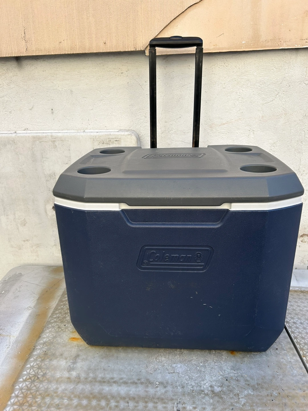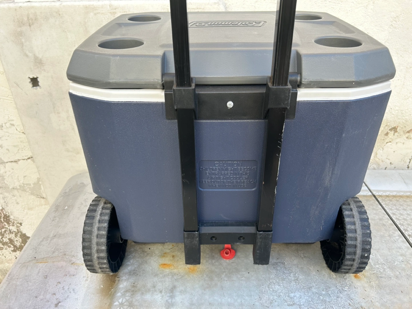 Durable wheeled cooler. Great for outdoor events. Features cup holders and a collapsible handle , Wheels, Drain , Perfect Condition,
