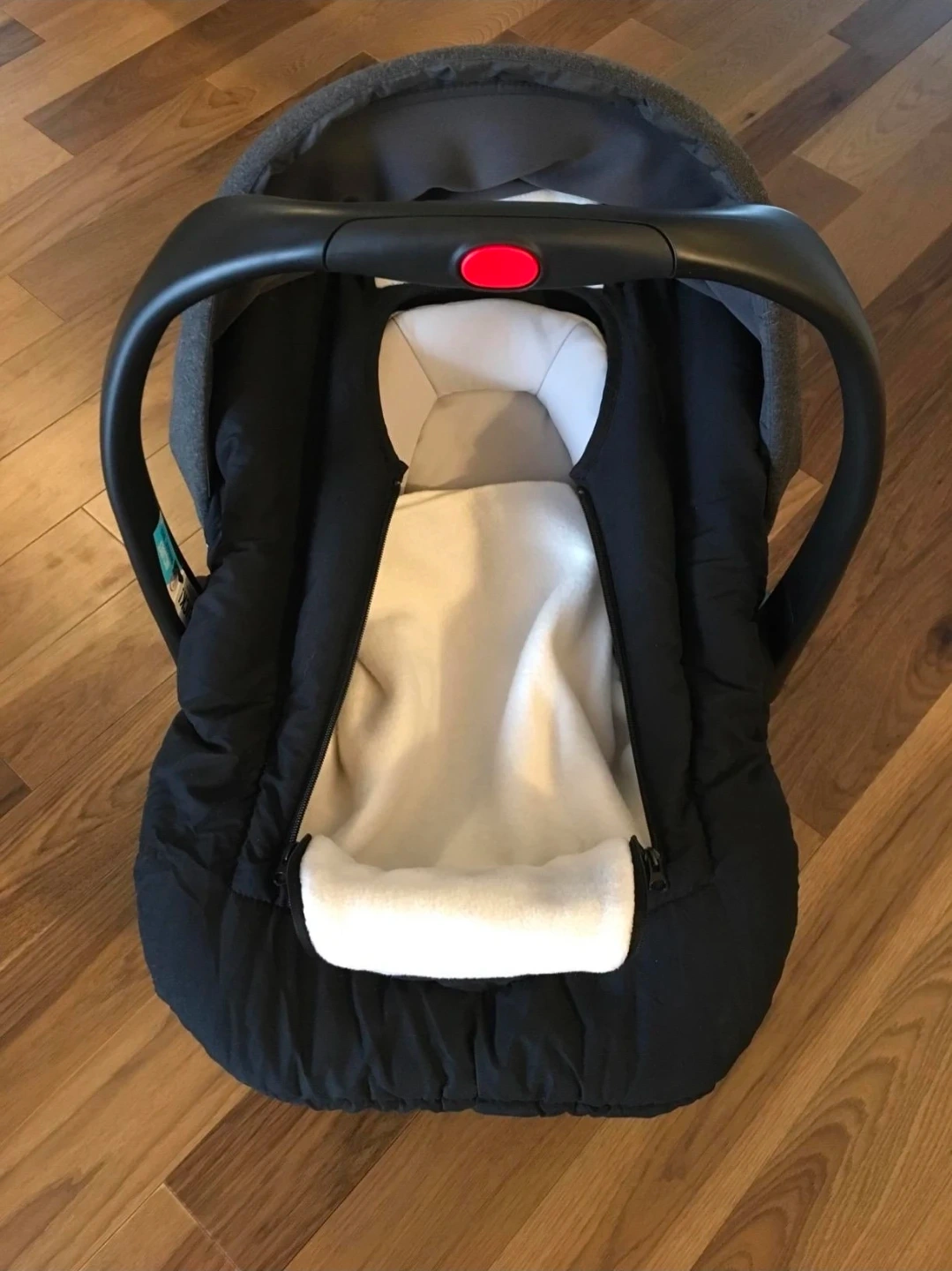 Keep baby warm and safe in cold weather with this infant car seat cover. It's water repellent and fleece-lined. It fits most car seats and has a double zipper for easy access.