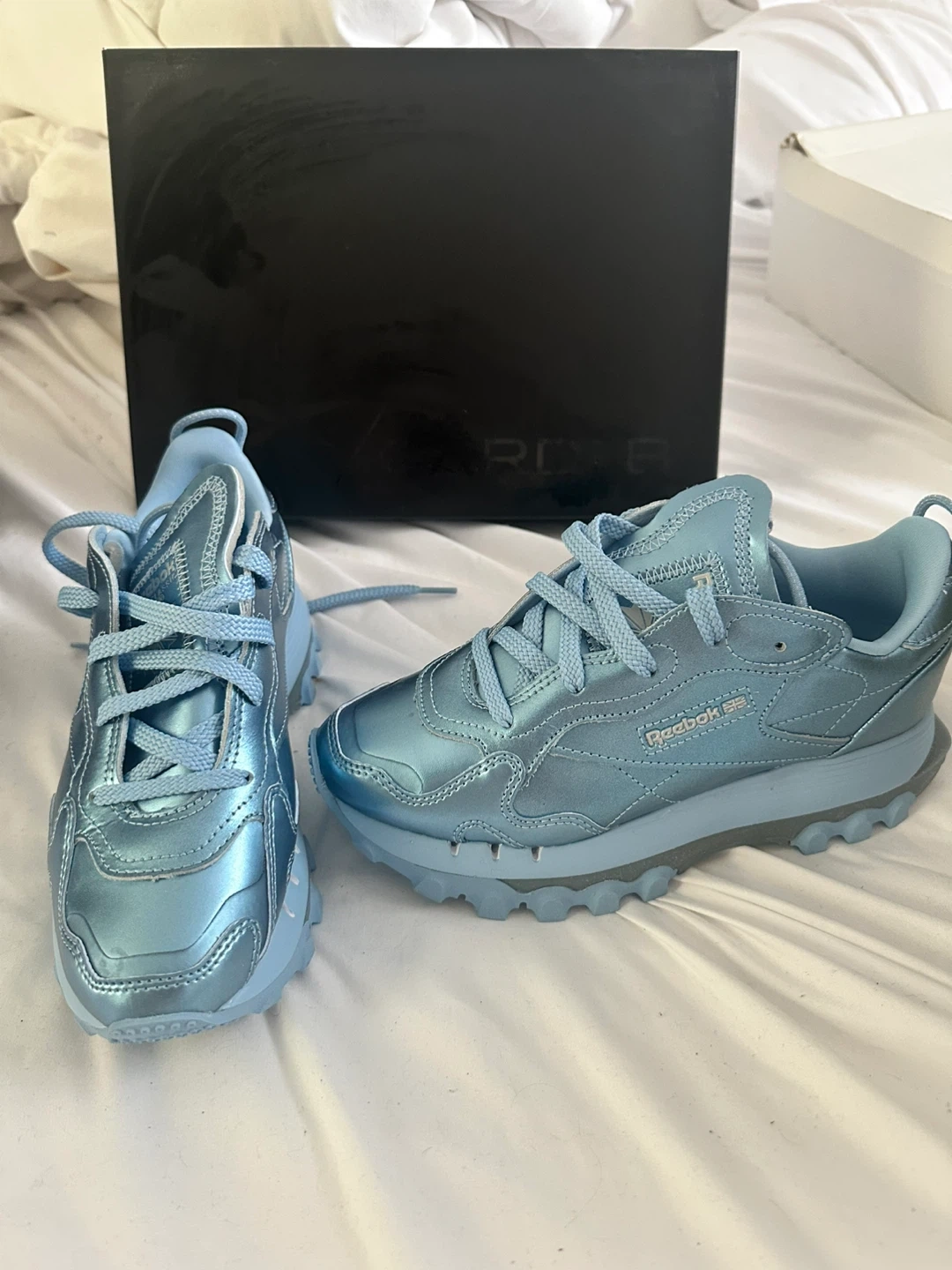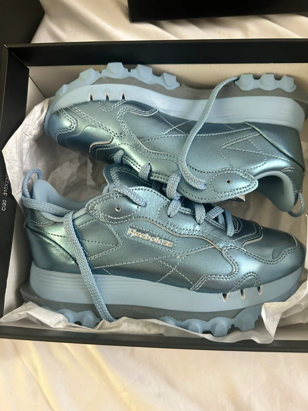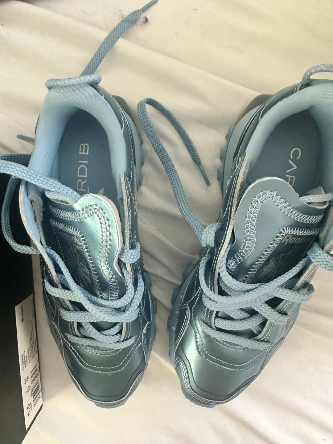 Selling a pair of Reebok Cardi B Classic Leather shoes in a beautiful light blue color! These stylish sneakers are in great condition and come with the original box. They're perfect for adding a unique touch to your wardrobe. Don't miss out!