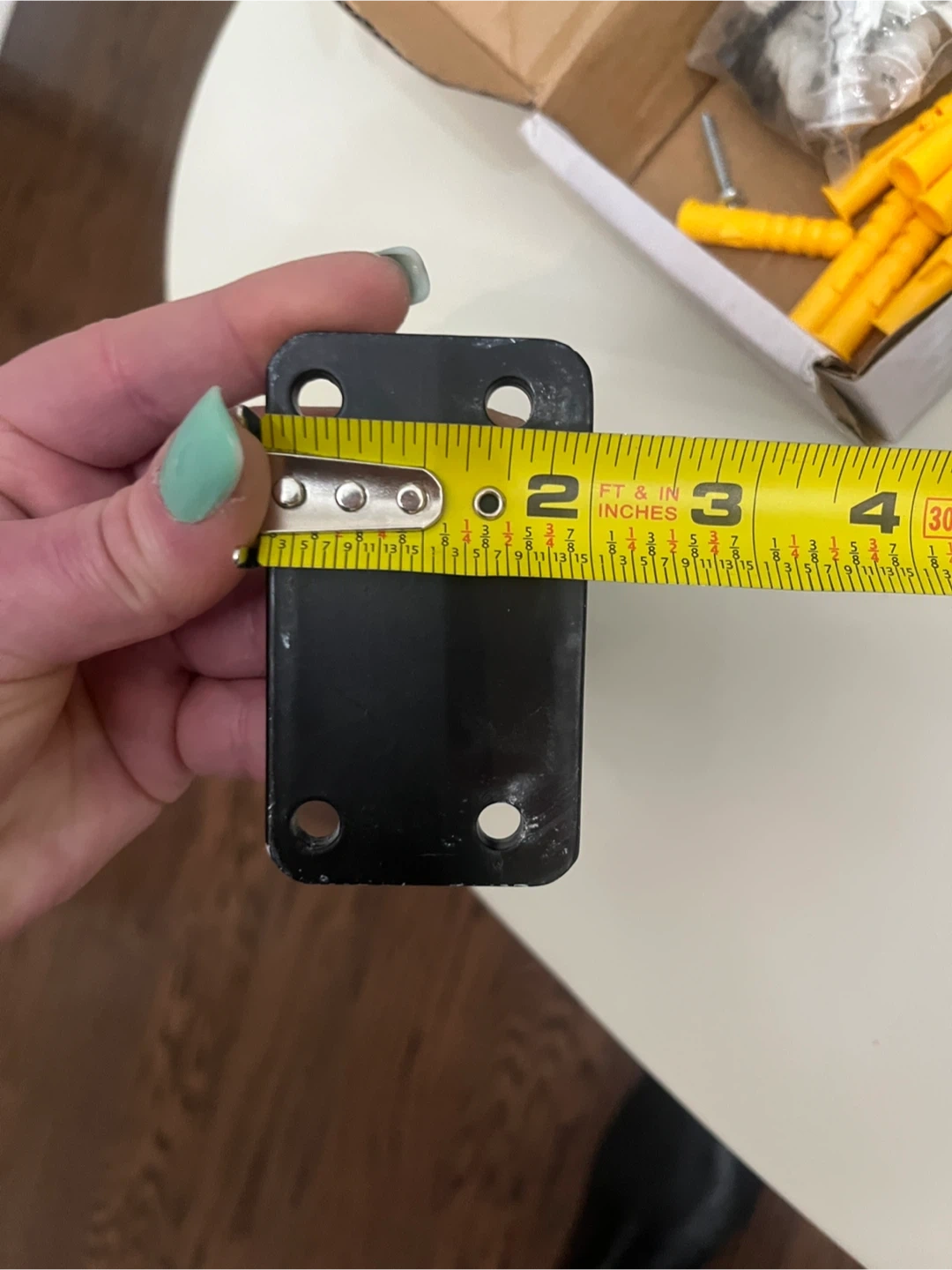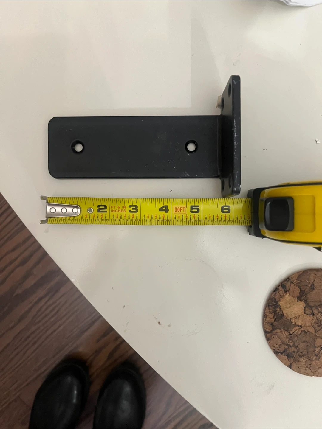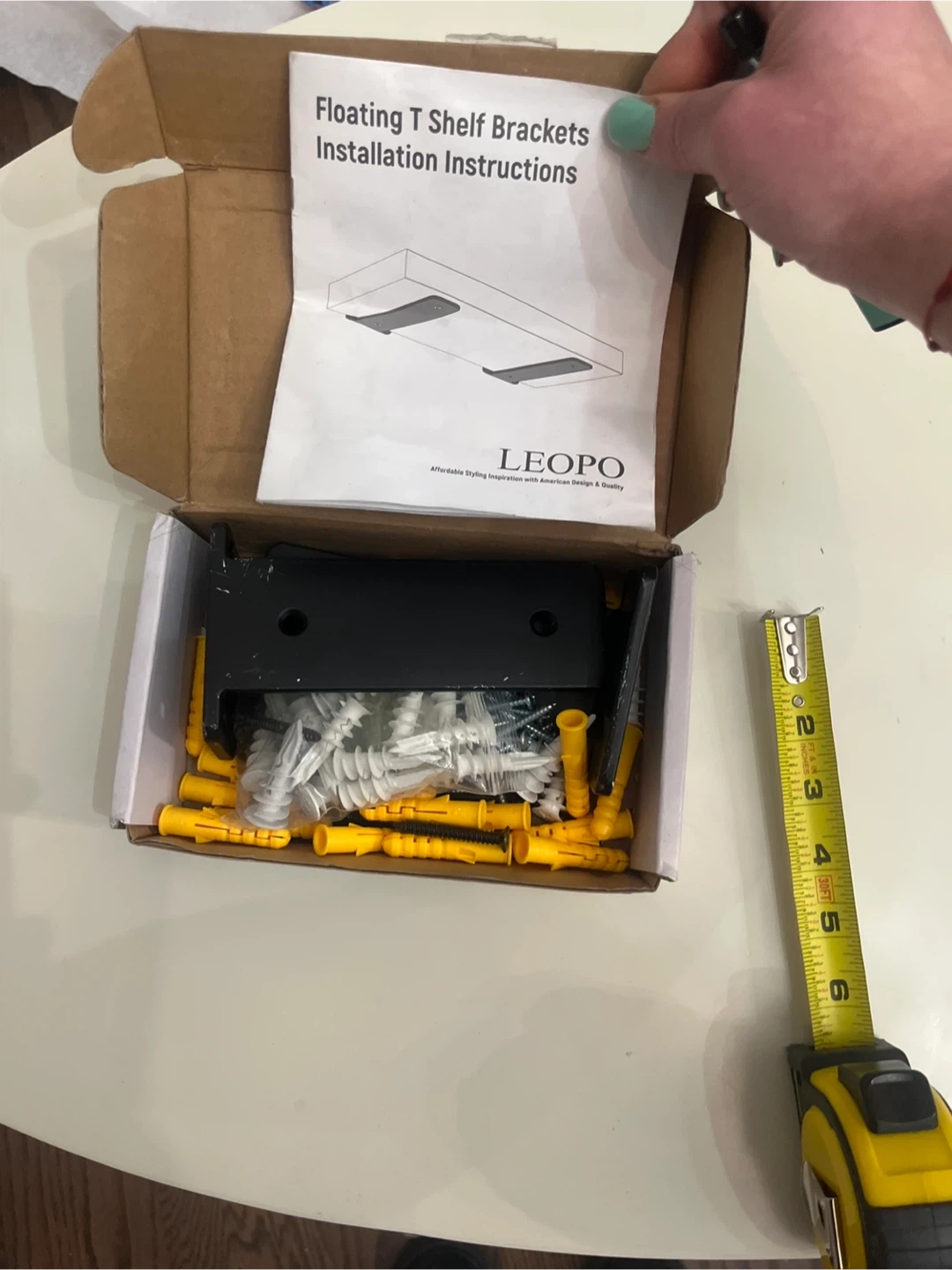 Includes 2 black floating T shelf brackets and hardware for installation. The brackets are approximately 6 inches long and 1.5 inches tall. Mounting screws and wall anchors are provided.
