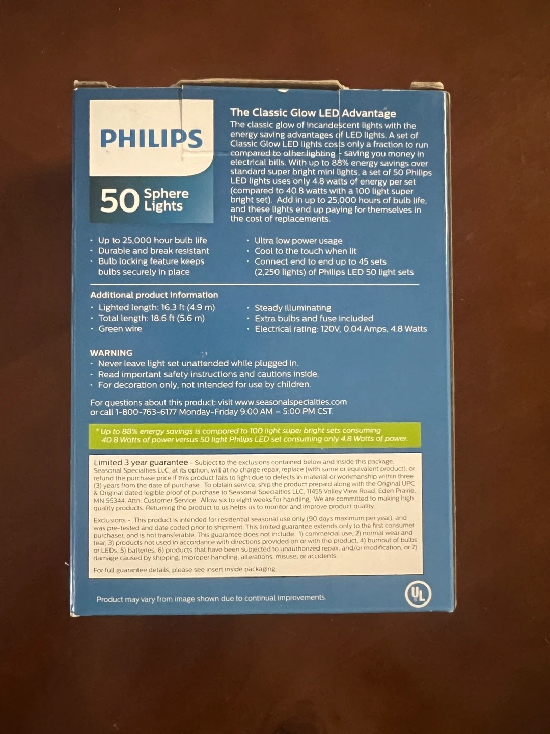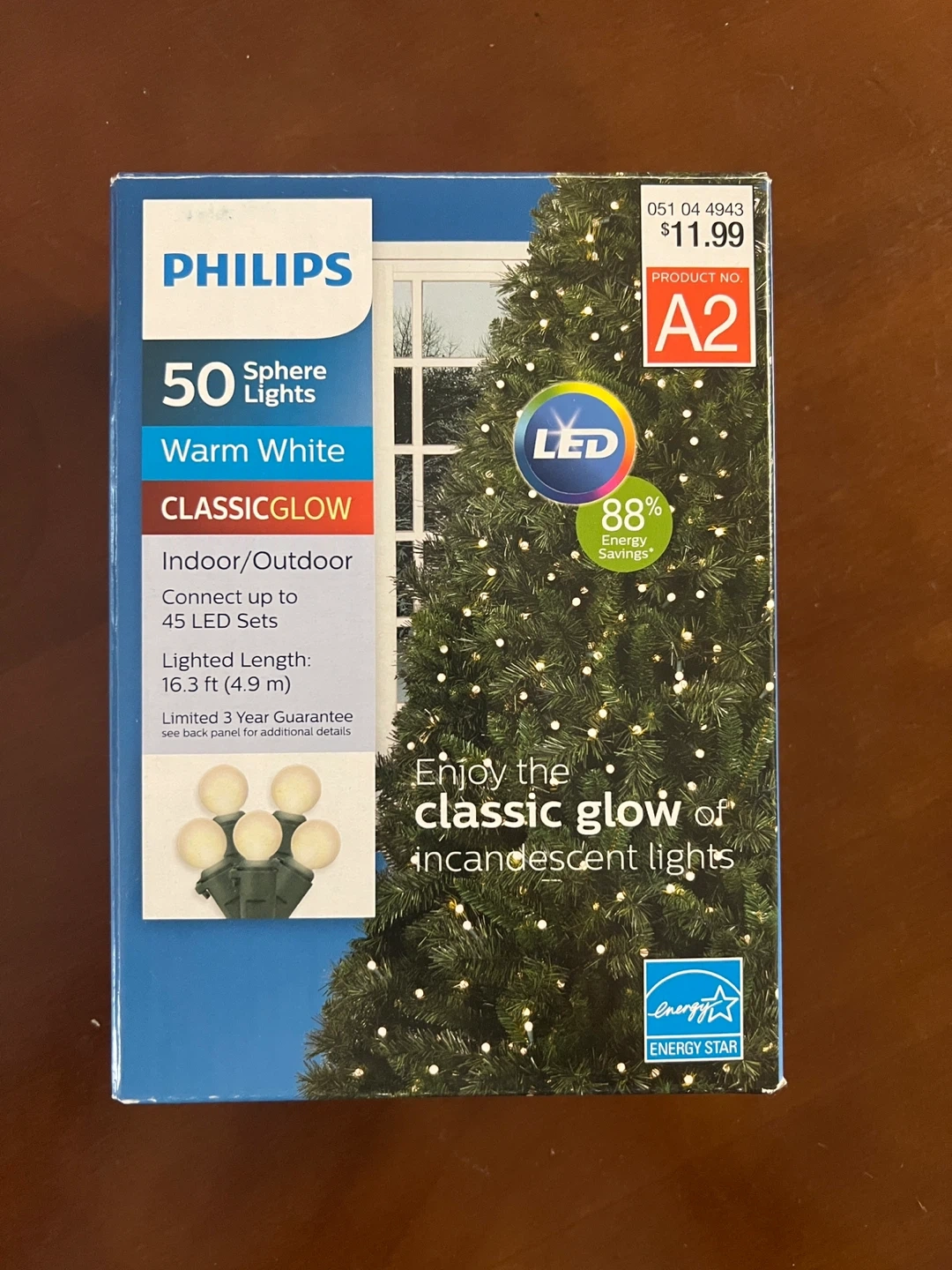 Selling a brand new set of Philips 50 Sphere Lights in warm white! These lights are suitable for both indoor and outdoor use. They feature a durable and break-resistant bulb, ensuring they stay securely in place. You can connect up to 45 LED light sets. The lighted length is 16.3 ft (4.9 m), and the total length is 18 ft (5.6 m). Enjoy the classic glow of incandescent lights with the energy-saving advantages of LEDs. The box is included!