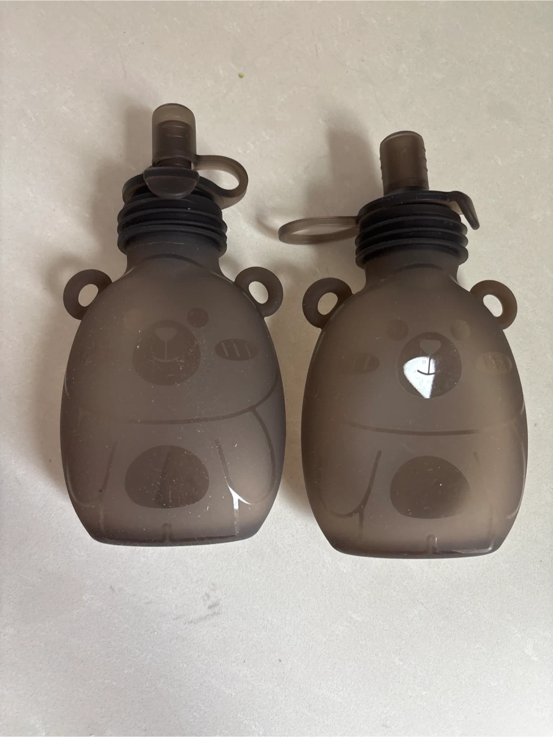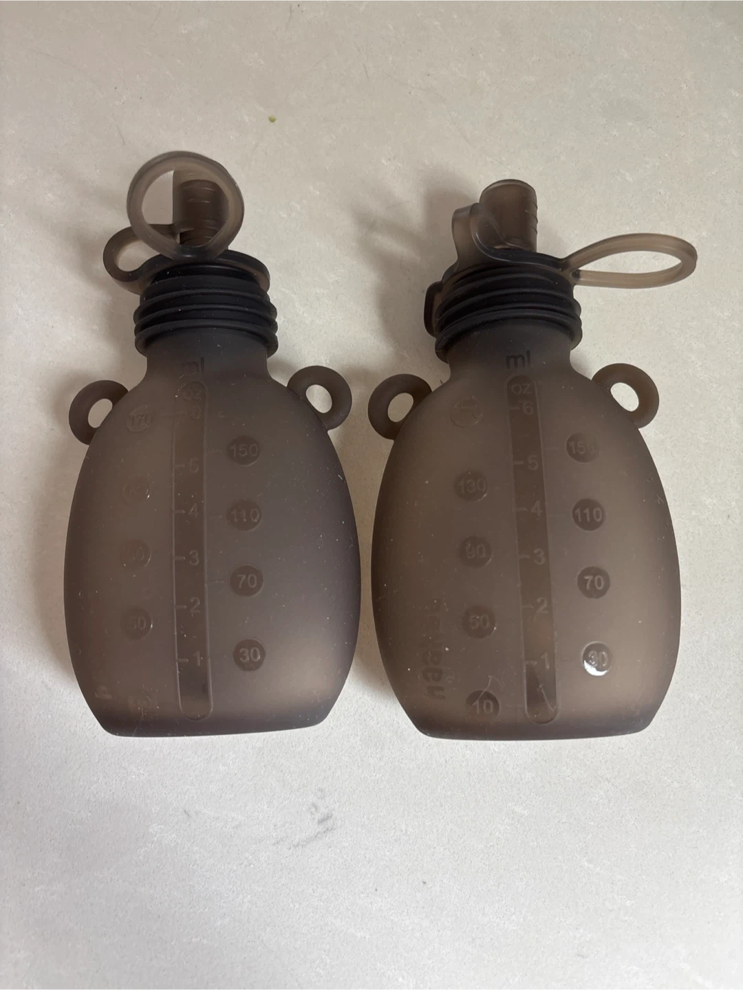 Selling a set of two reusable silicone food pouches. They're great for storing and feeding purees, smoothies, or yogurt. Each pouch has measurement markings up to 150ml.