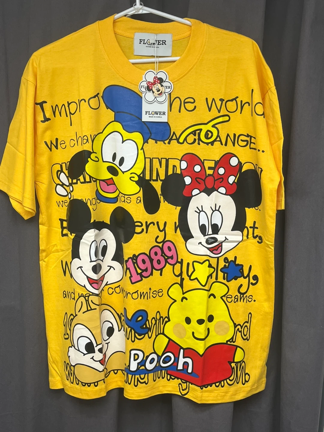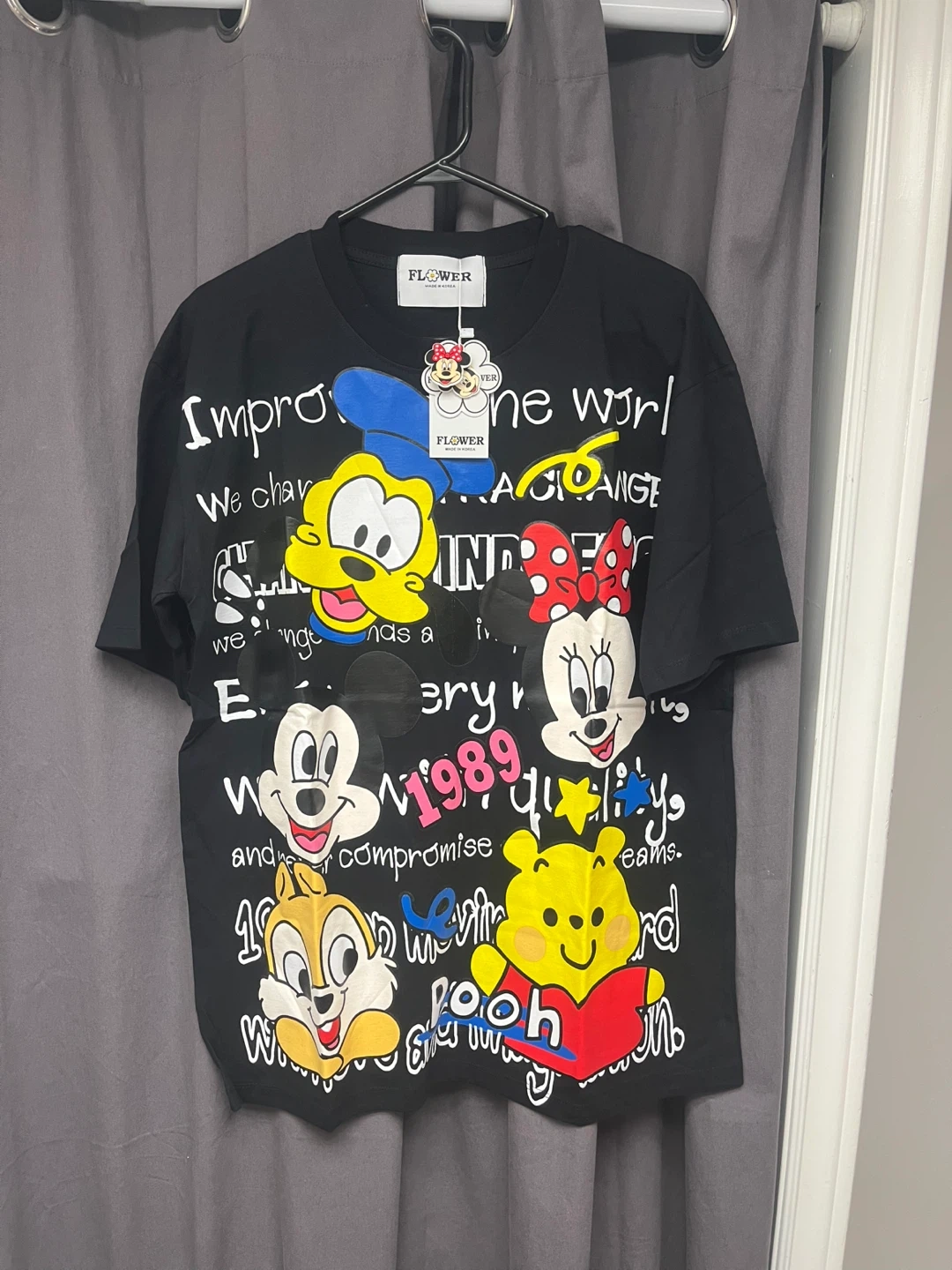 Here's a fun Flower brand t-shirt featuring classic Disney characters like Mickey, Minnie, Goofy, Winnie the Pooh, and Chip and Dale! It's a great way to add some cheer to your wardrobe