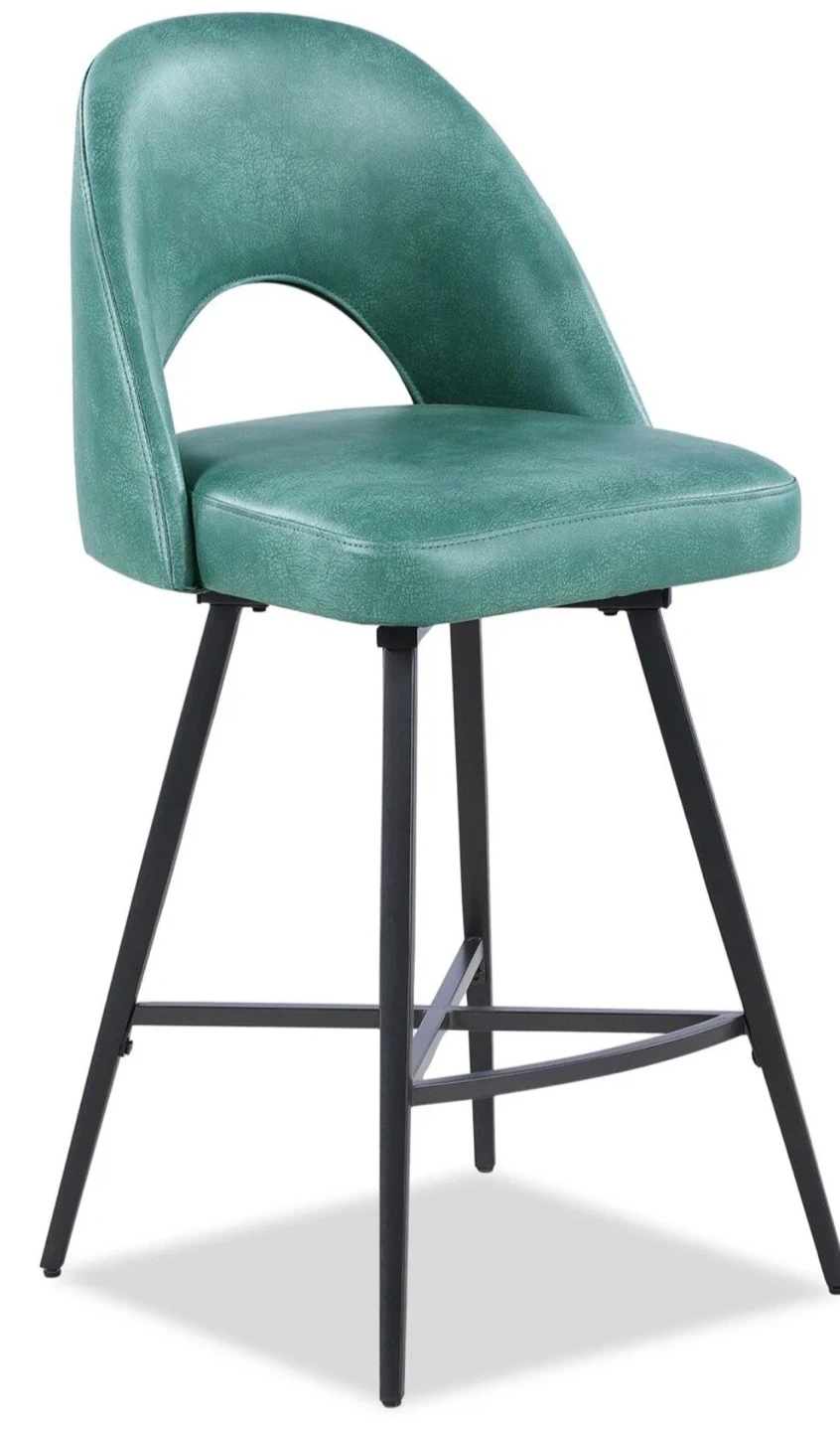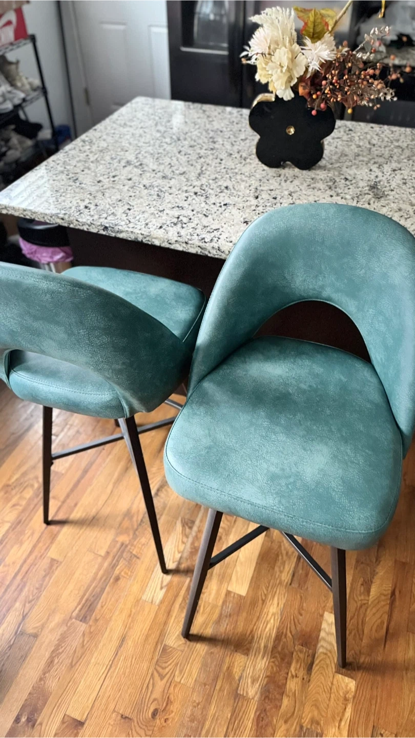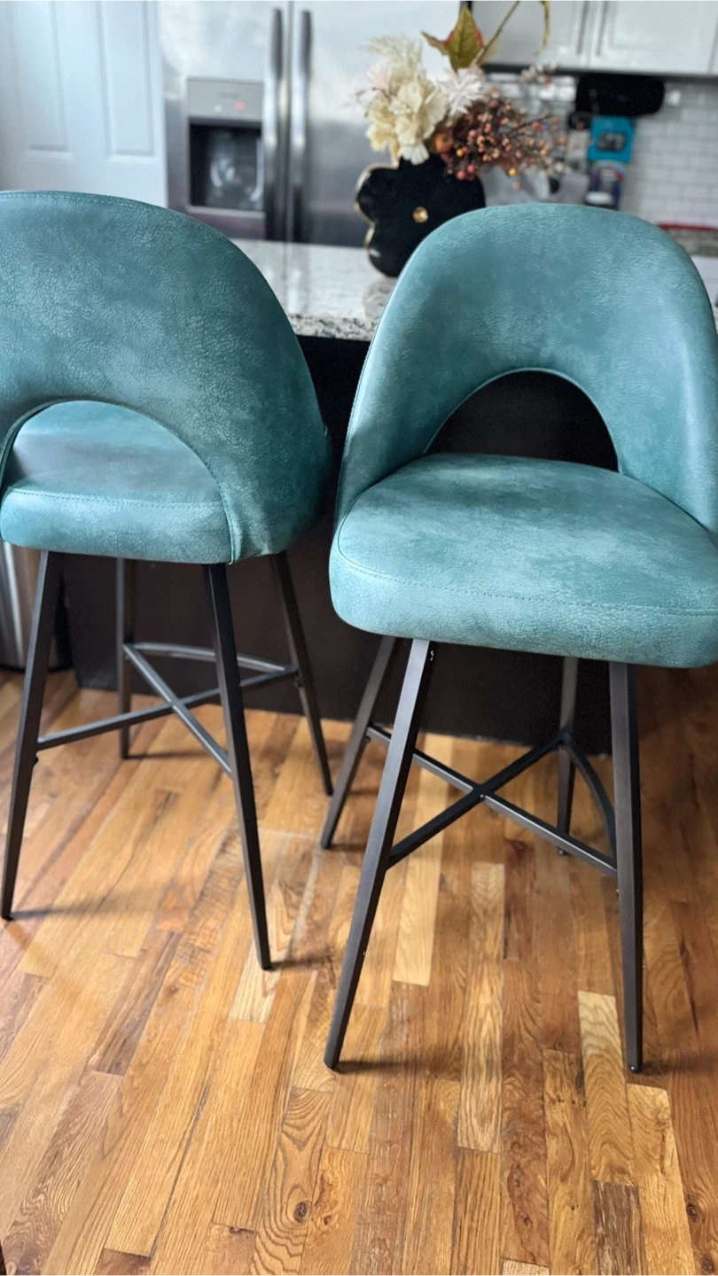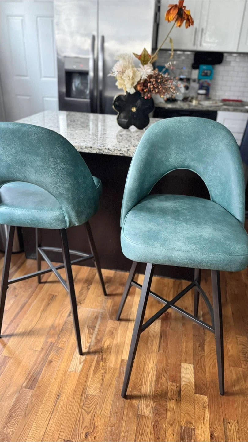 Add a stylish touch to your kitchen island or bar area with this set of two teal swivel bar stools. They feature a comfortable curved back and sturdy metal legs. Upholstered in a textured faux leather for a chic look and easy cleaning.