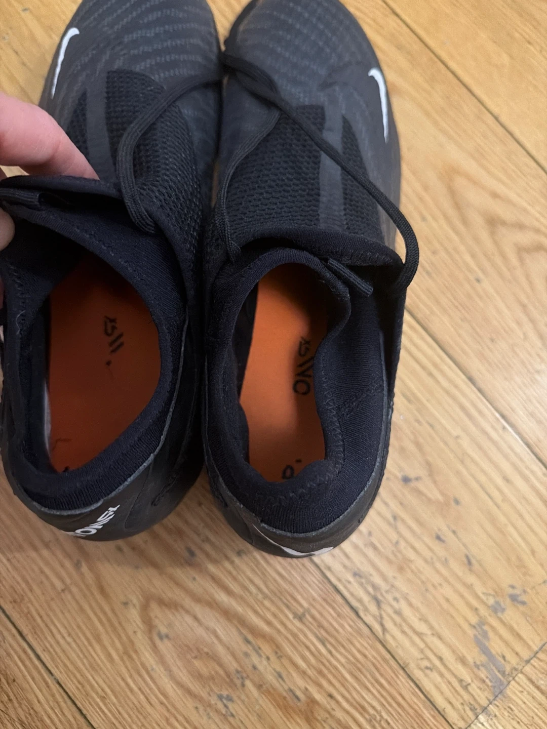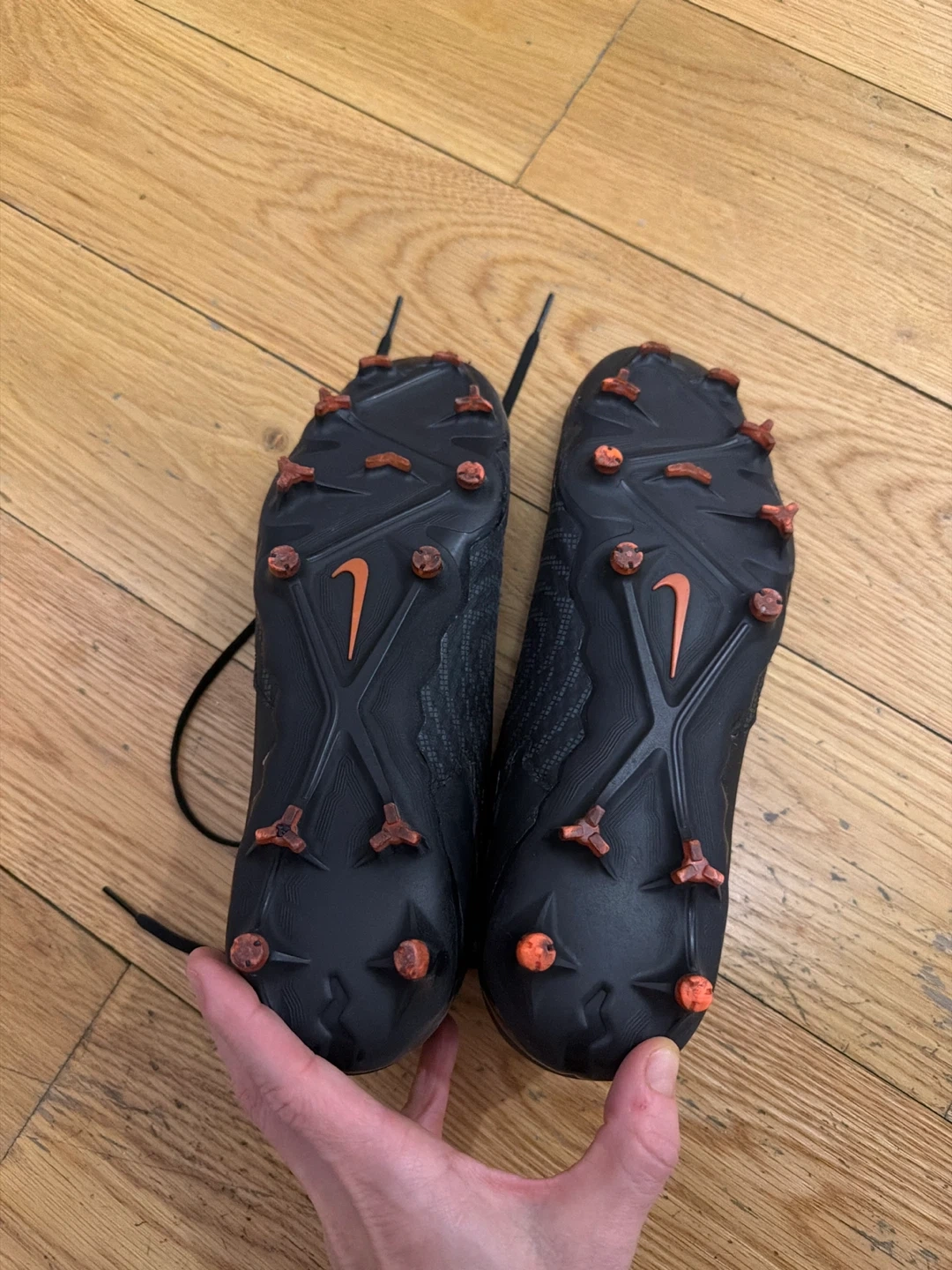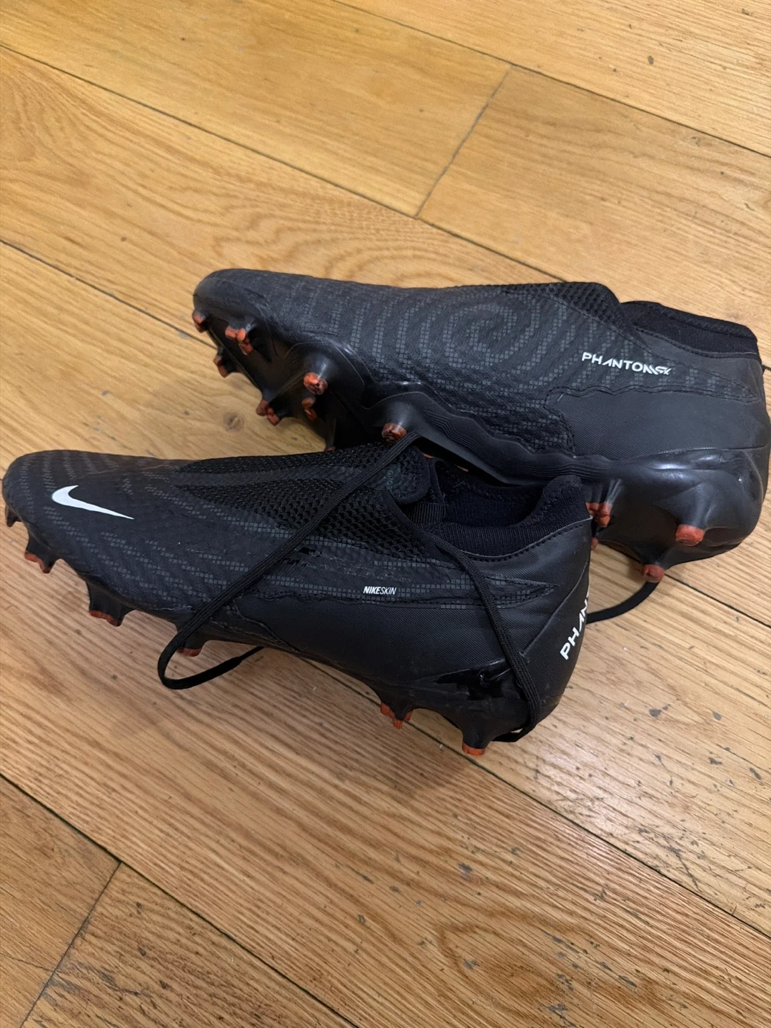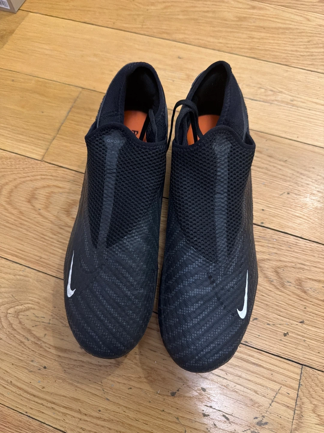 These Nike Phantom GX soccer cleats are designed for firm ground play. They feature Nike Skin technology for a responsive feel. The black colorway with orange accents offers a classic look on the field. Size US 10.5