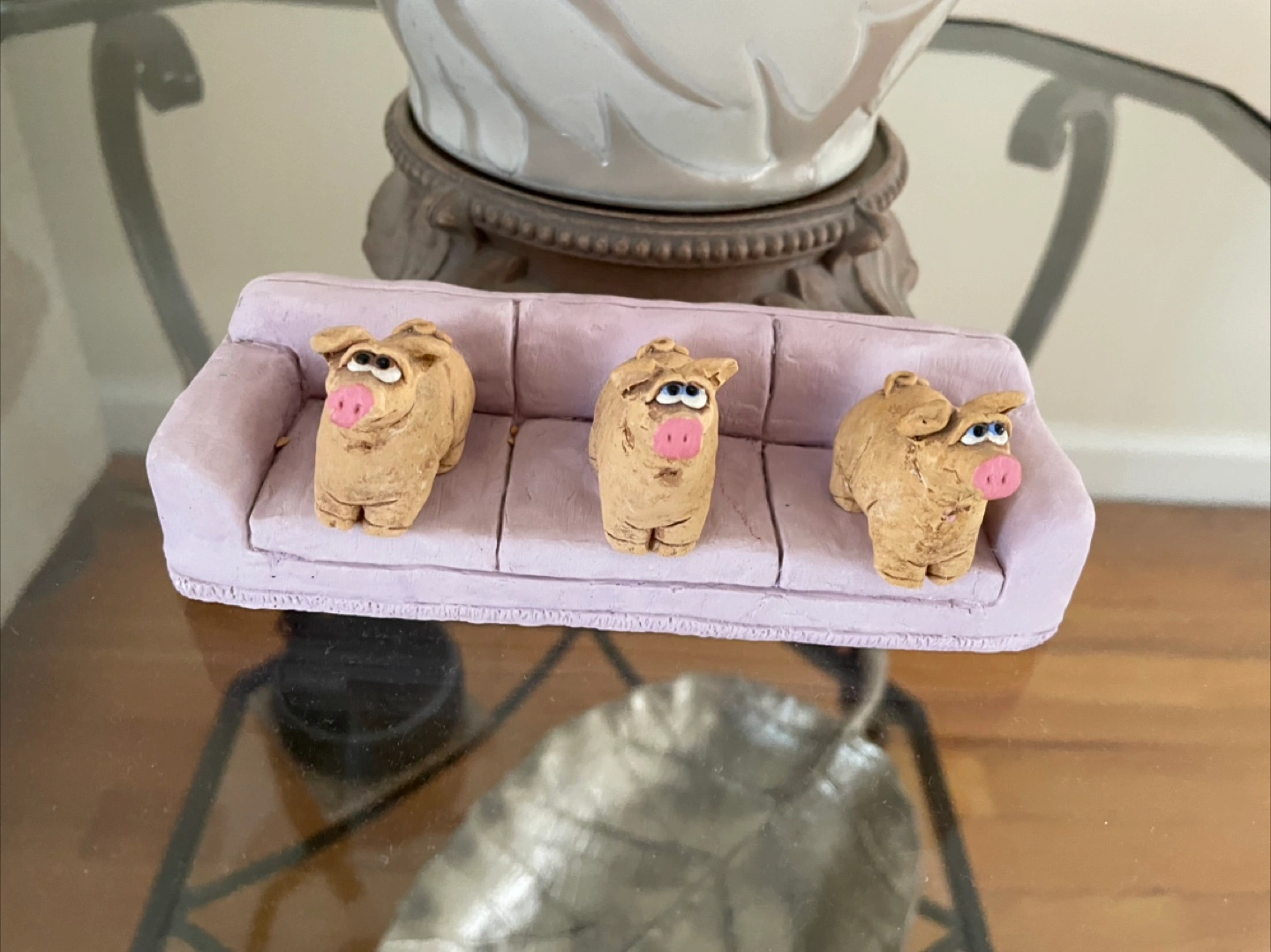 Here are three cute pig figurines sitting on a couch! They are in good condition and would look great in your home Great for pig lovers