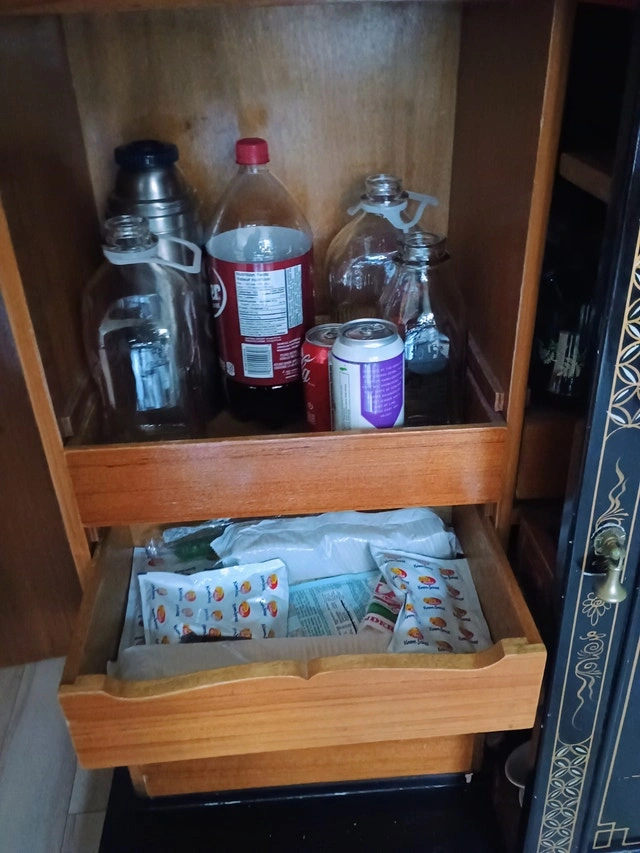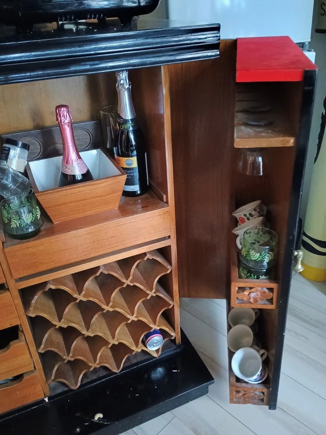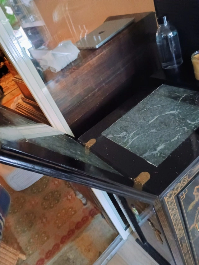 Black lacquer folding bar cabinet. A very fun piece. Well used, plenty of small flaws. On casters. Marble inlay top. Very heavy.
