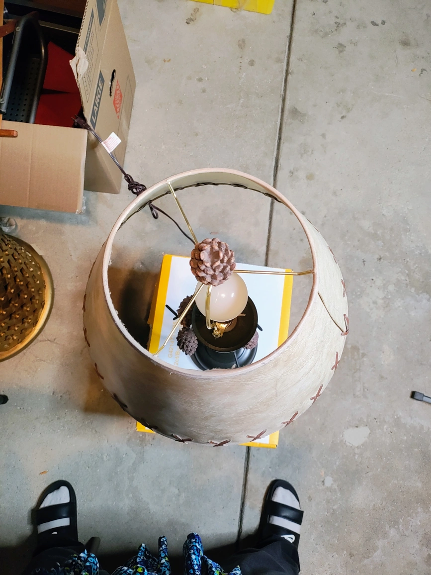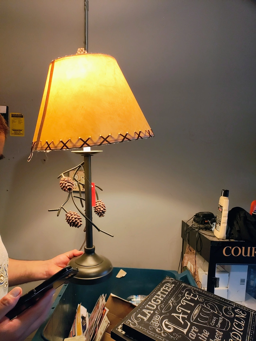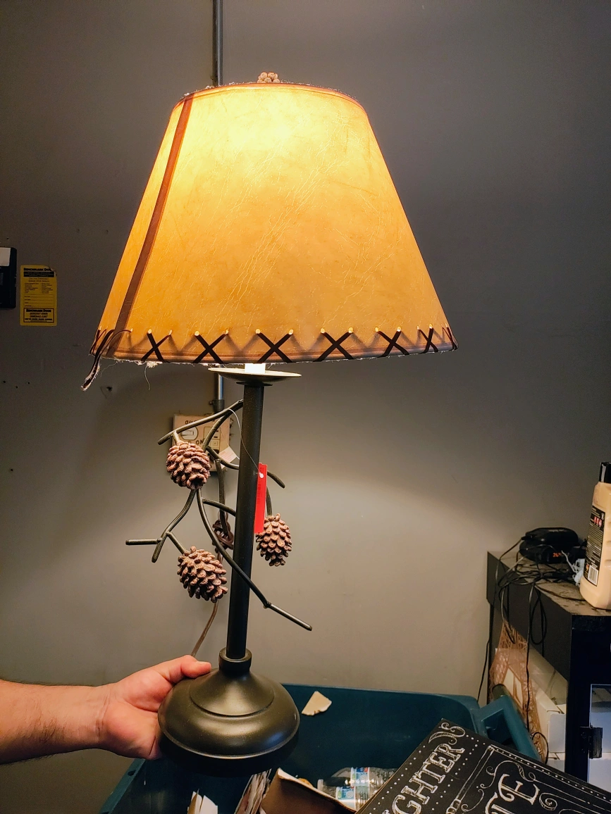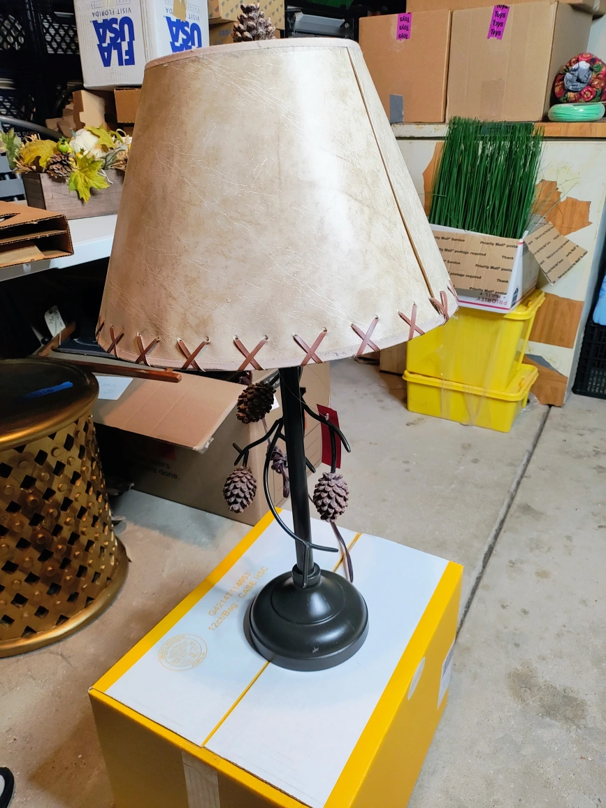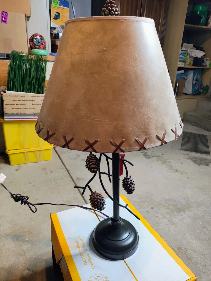 This is a table lamp with a pine cone accent. It features a brown faux leather shade with a criss-cross stitch design. The base is black with pine cone decorations. About 29 inches tall.