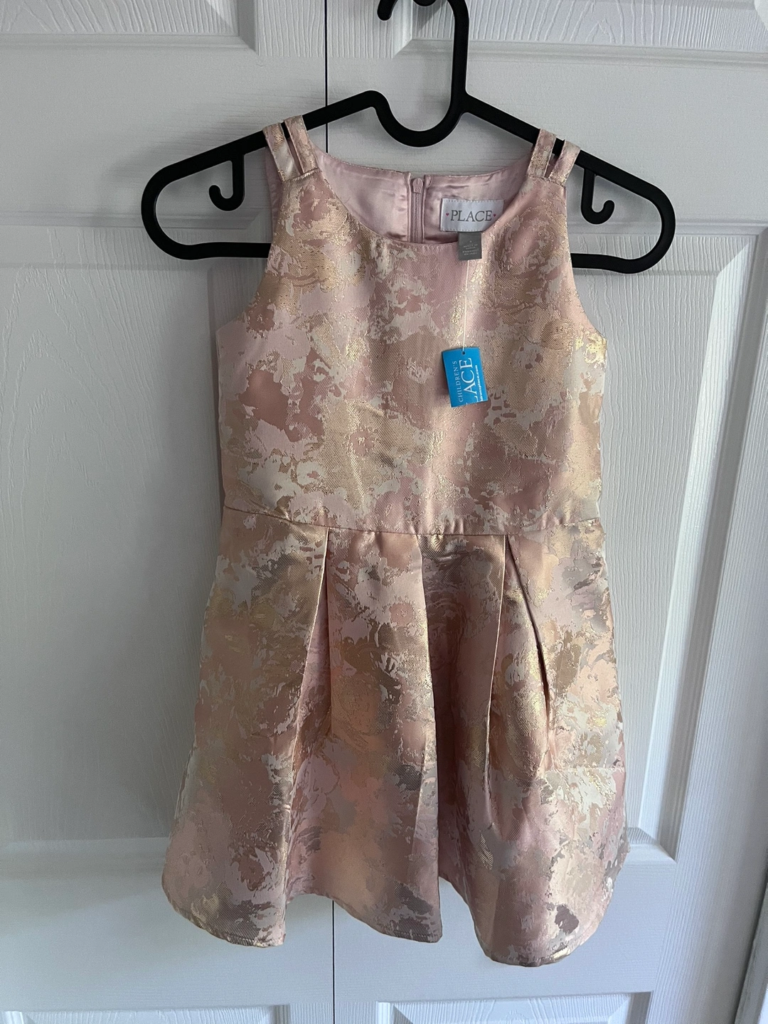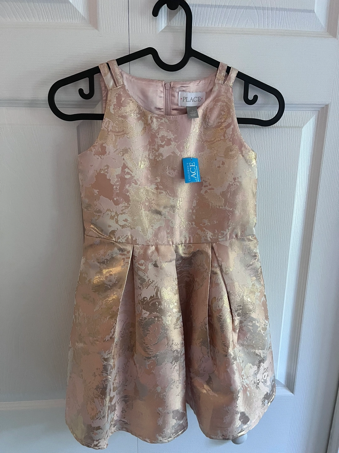 This dress is perfect for a special occasion. It is a beautiful pink and gold colour with a fun pattern. It is made of a soft material and has a full skirt. It is sleeveless and has a zipper on the back.