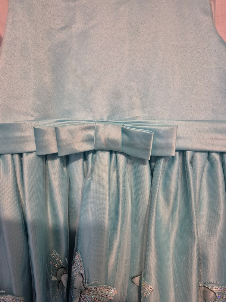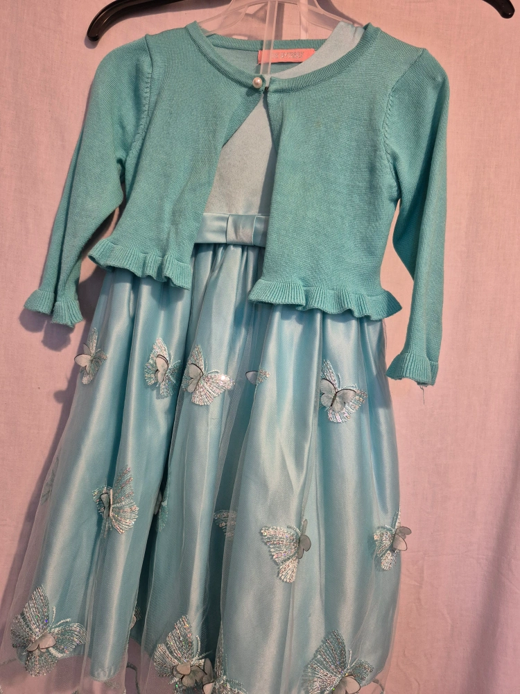 A cute, light blue dress from Pink Butterfly, size 4. It has a matching cardigan with a pearl button. The dress is decorated with butterfly accents and a bow at the waist
