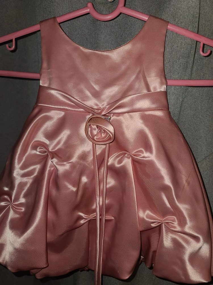 Pink satin baby dress with a flower on the back. Sleeveless with a round neckline.