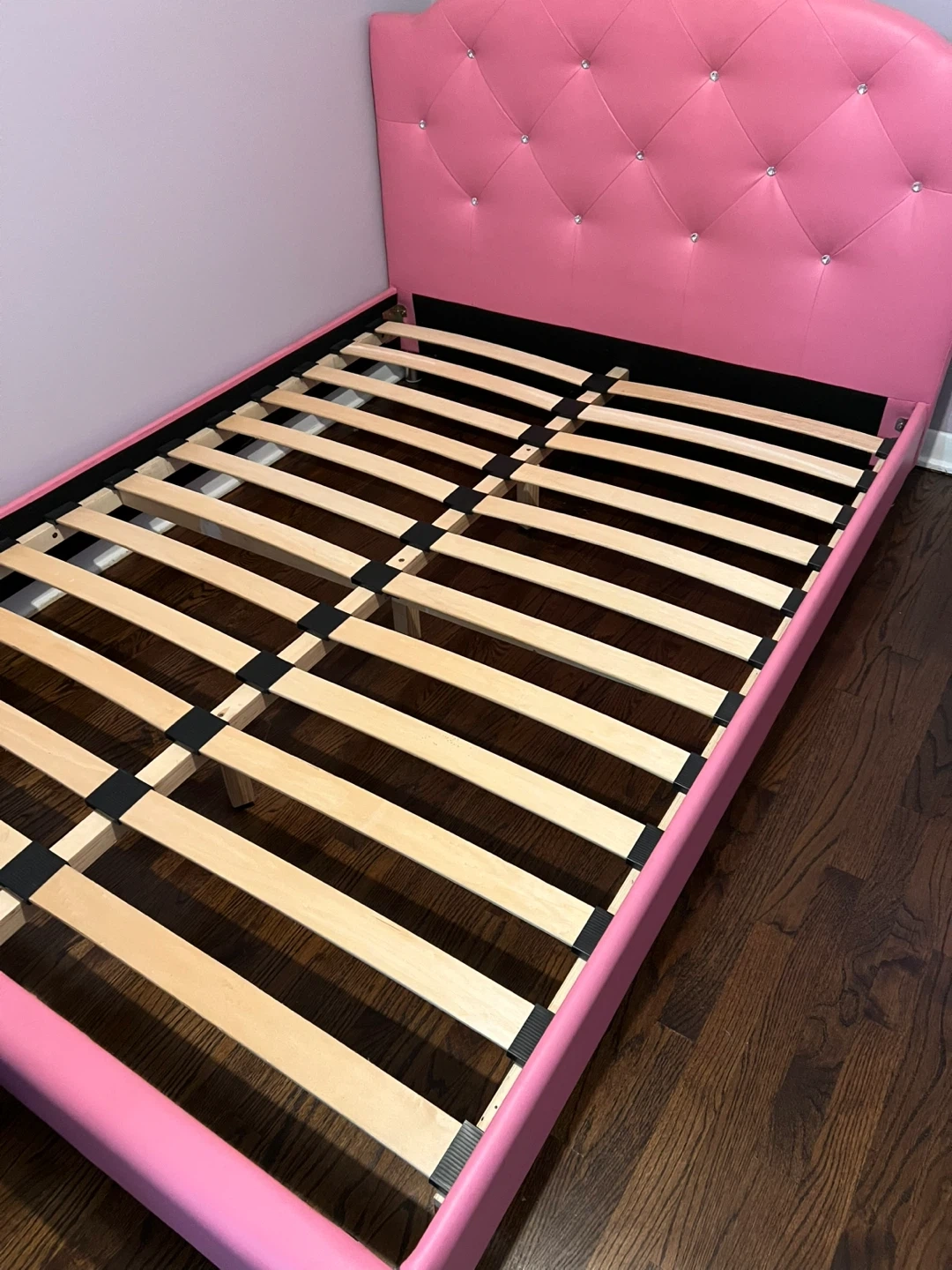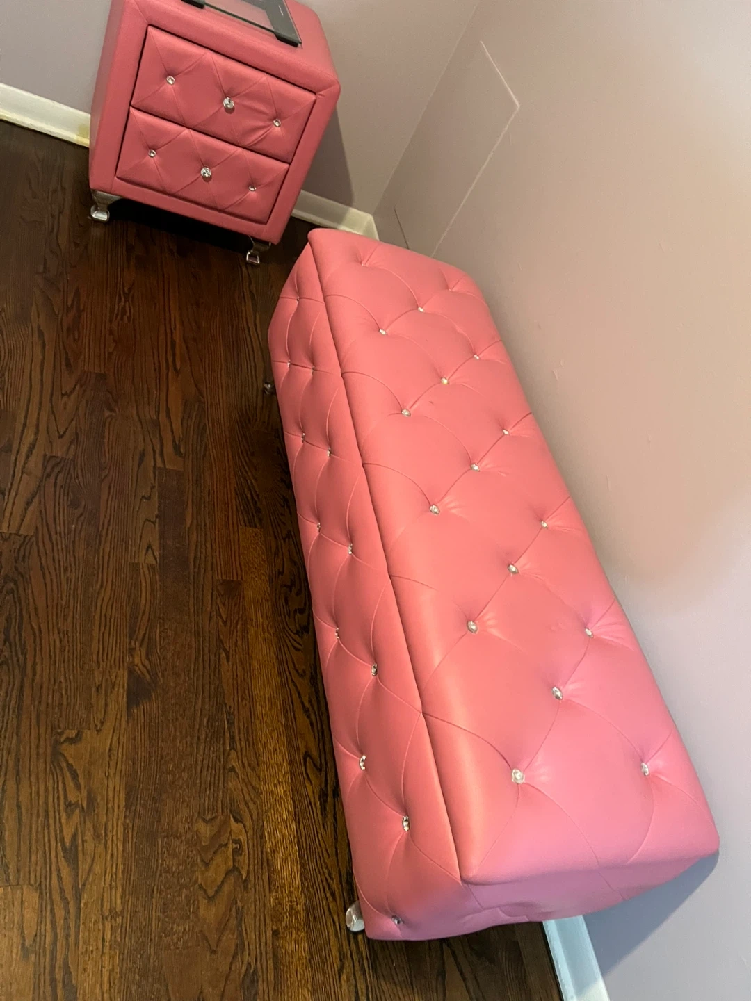 10Selling a lovely pink tufted bedroom set! This includes a bed frame, a stylish mirror, and a matching nightstand. The set is in good condition and would add a touch of glam to any bedroom. Perfect for anyone looking to create a fun and unique space