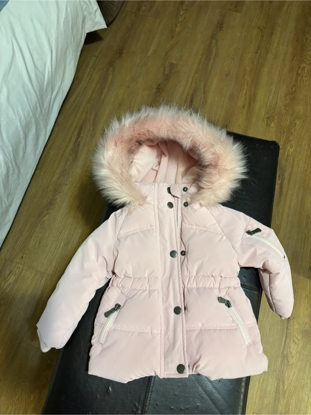 10A cozy pink puffer coat perfect for winter! It features a faux fur hood and a button-up closure. This coat is in great condition and ready to keep your little one warm and stylish during the colder months. Size 6-9 months. Never worn.