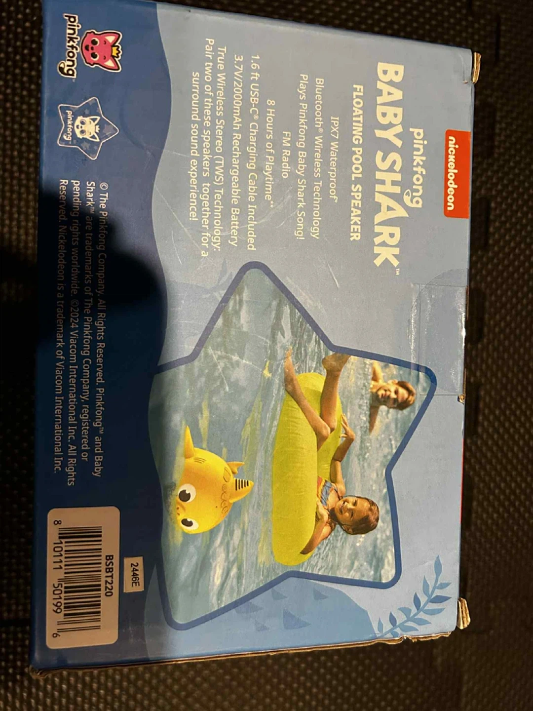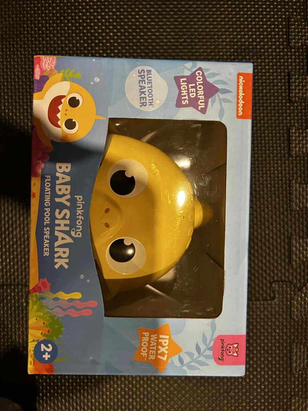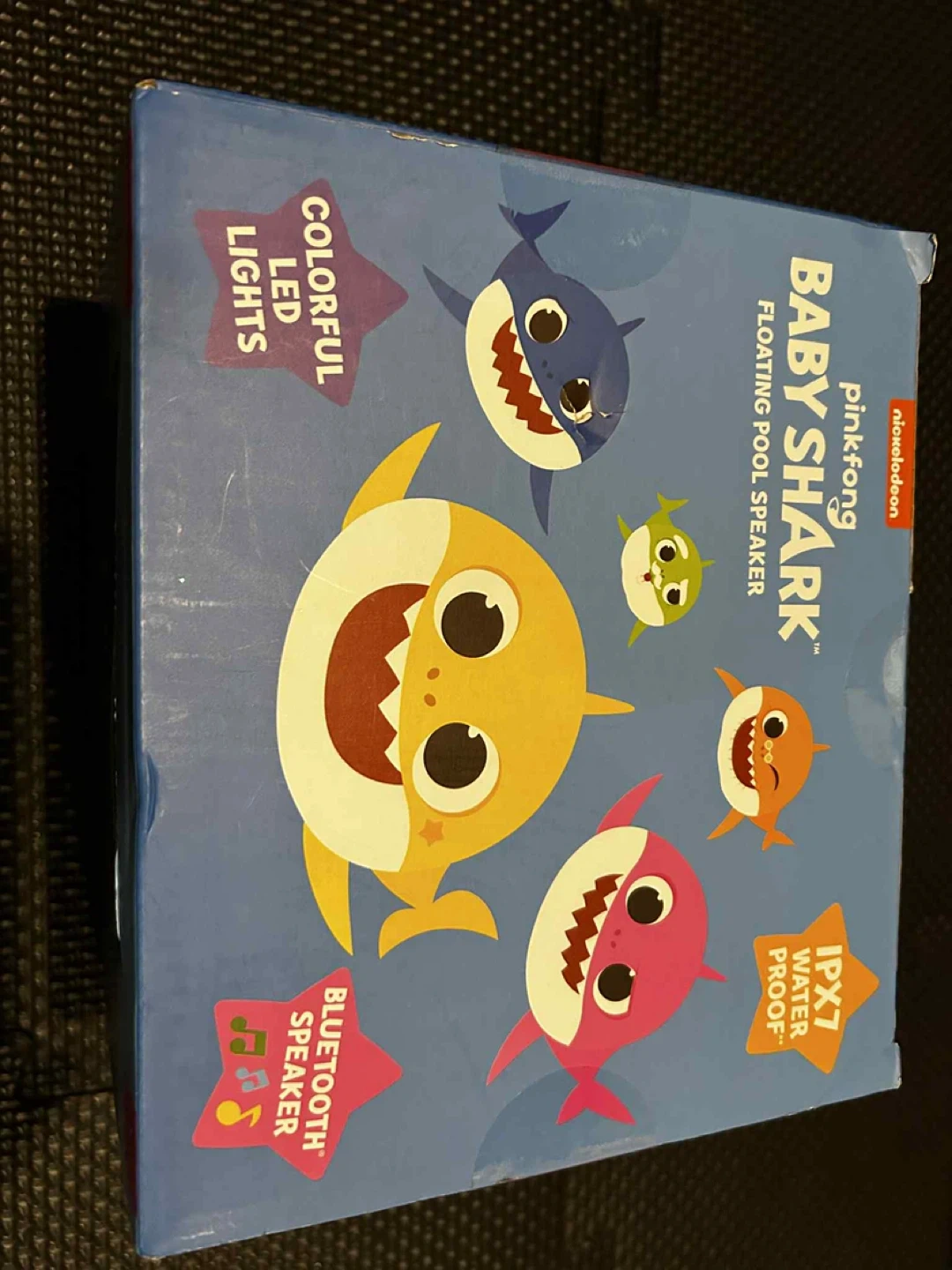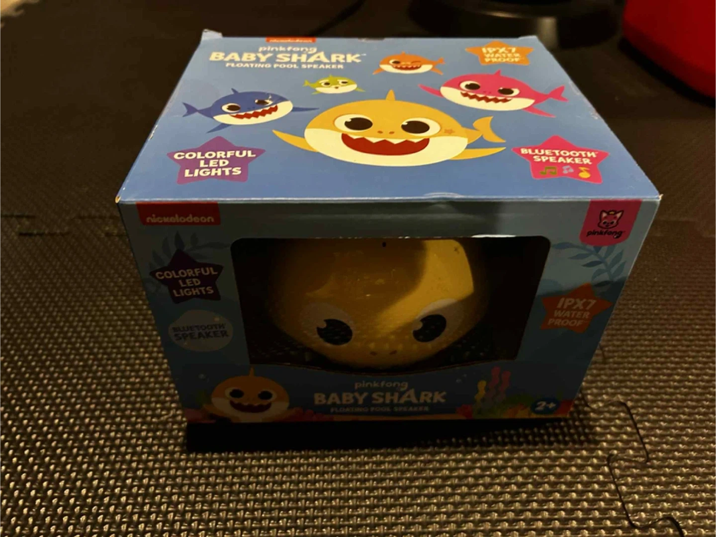 10Selling a brand new Pinkfong Baby Shark Floating Pool Speaker! It's IPX7 waterproof and has Bluetooth wireless technology. It plays the Pinkfong Baby Shark song and has FM radio. Get up to 8 hours of playtime with the included USB-C charging cable. Features colorful LED lights too!