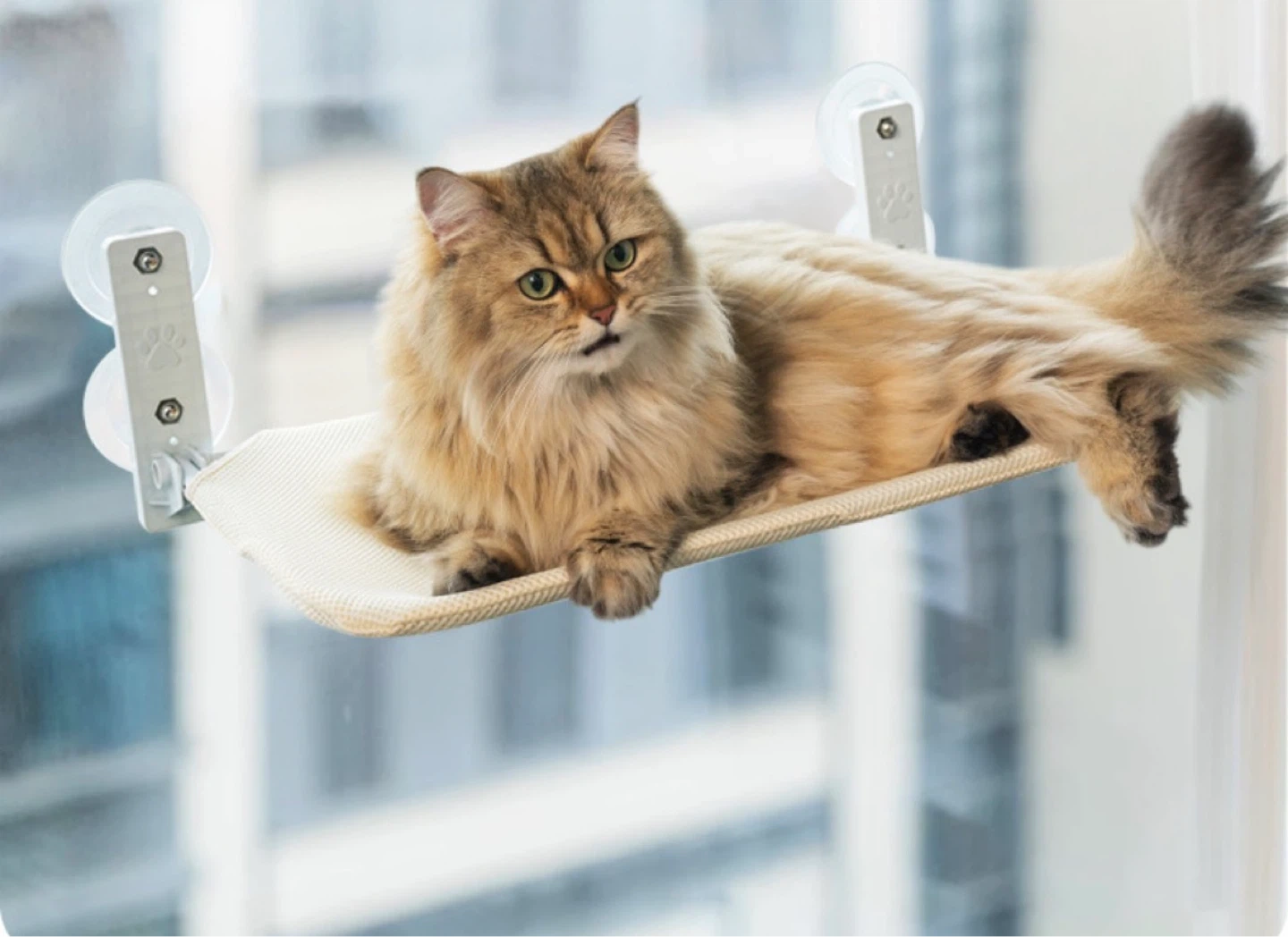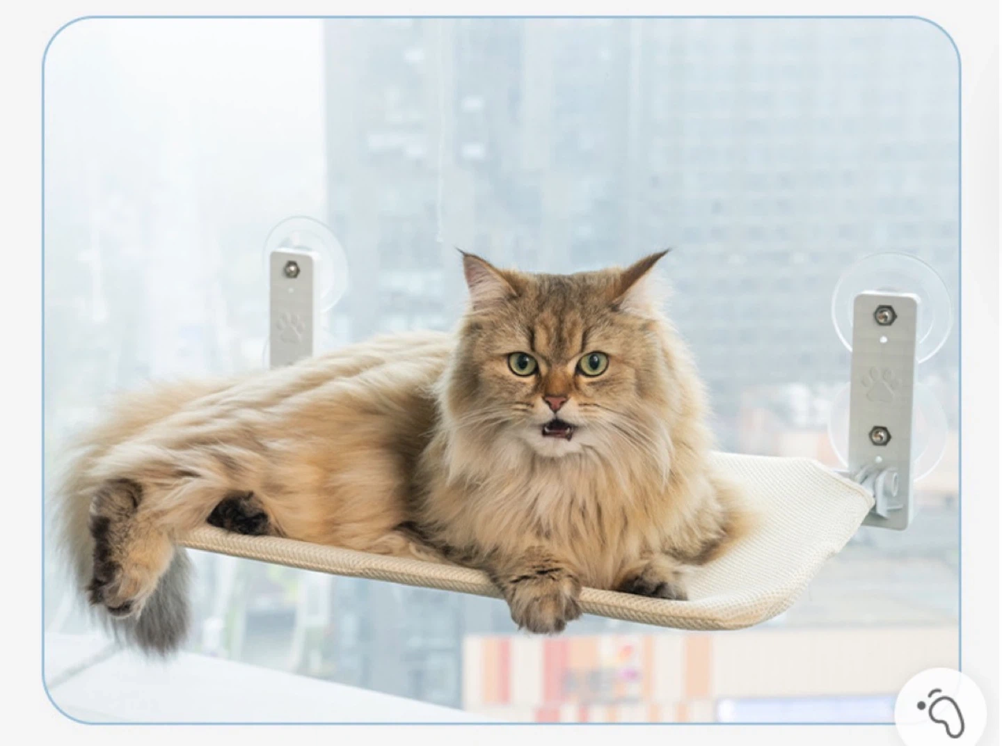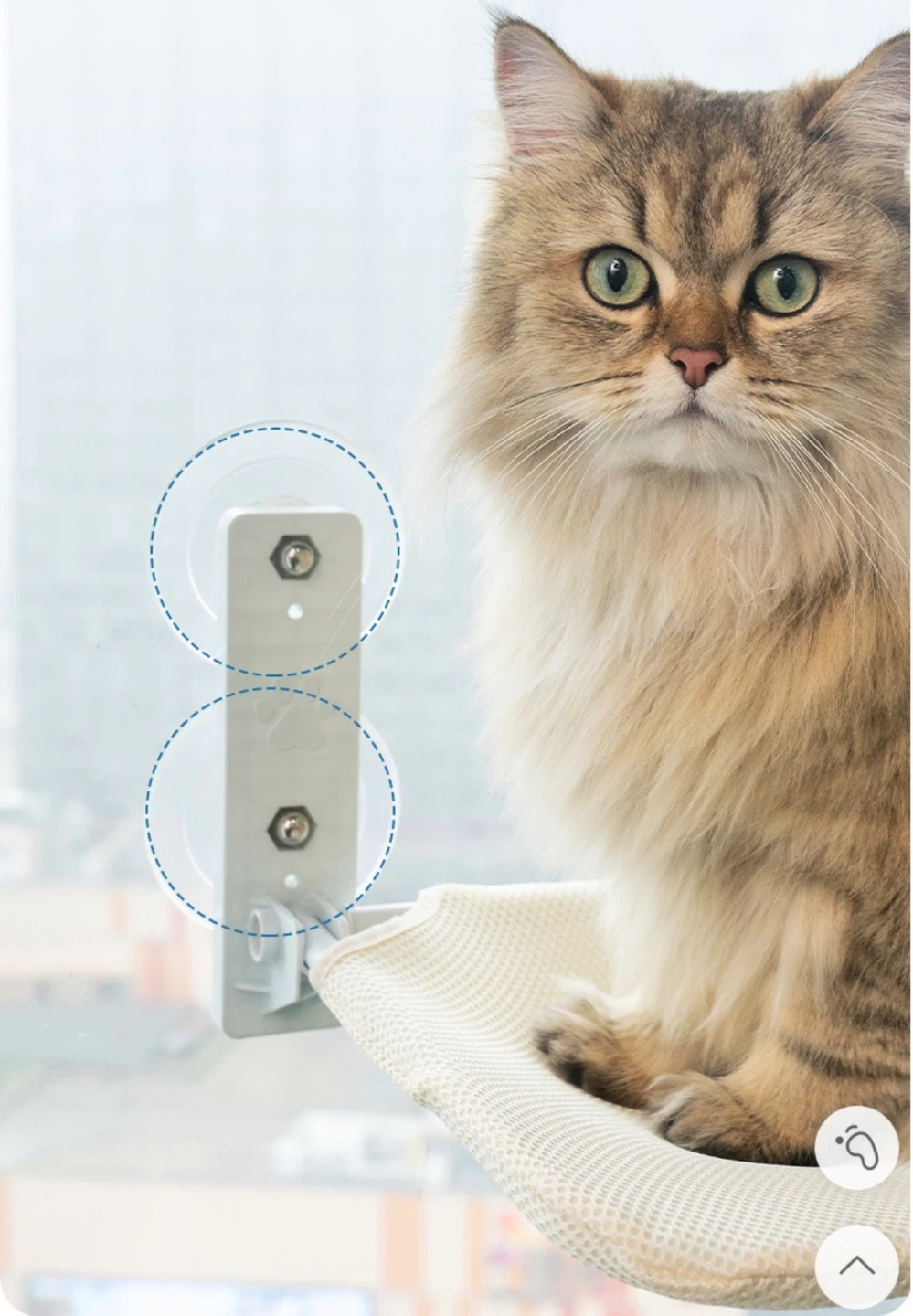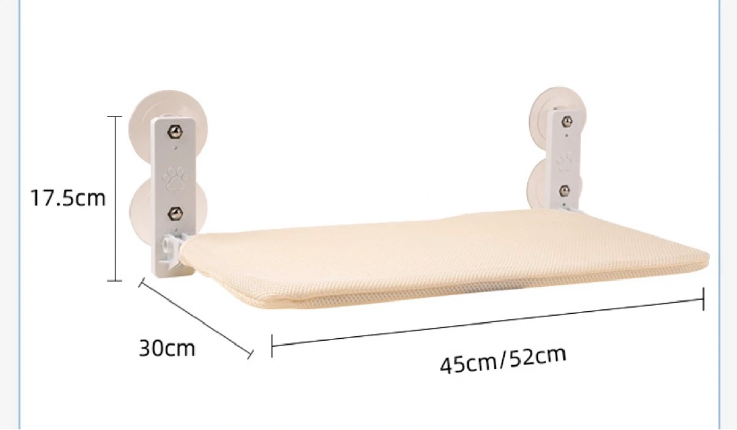 This is a cat window perch with suction cup mounting. It supports up to 20kg and measures 45-52cm by 30cm with a height of 17.5cm. The hammock is made of a durable mesh material.