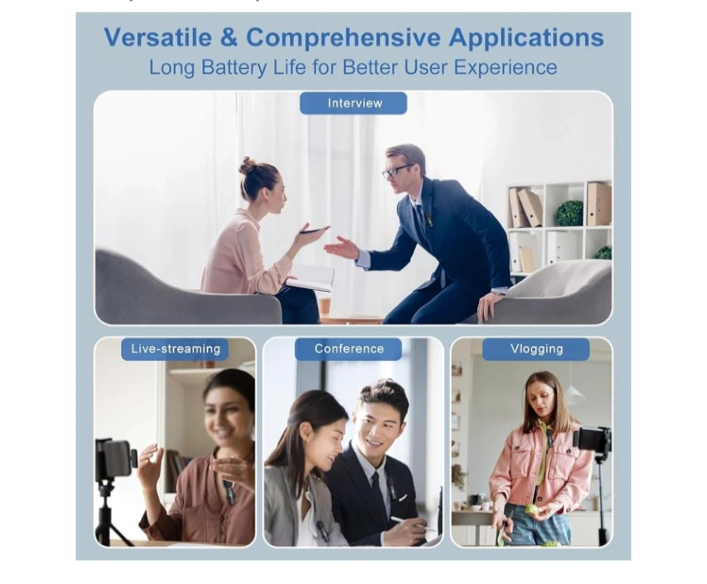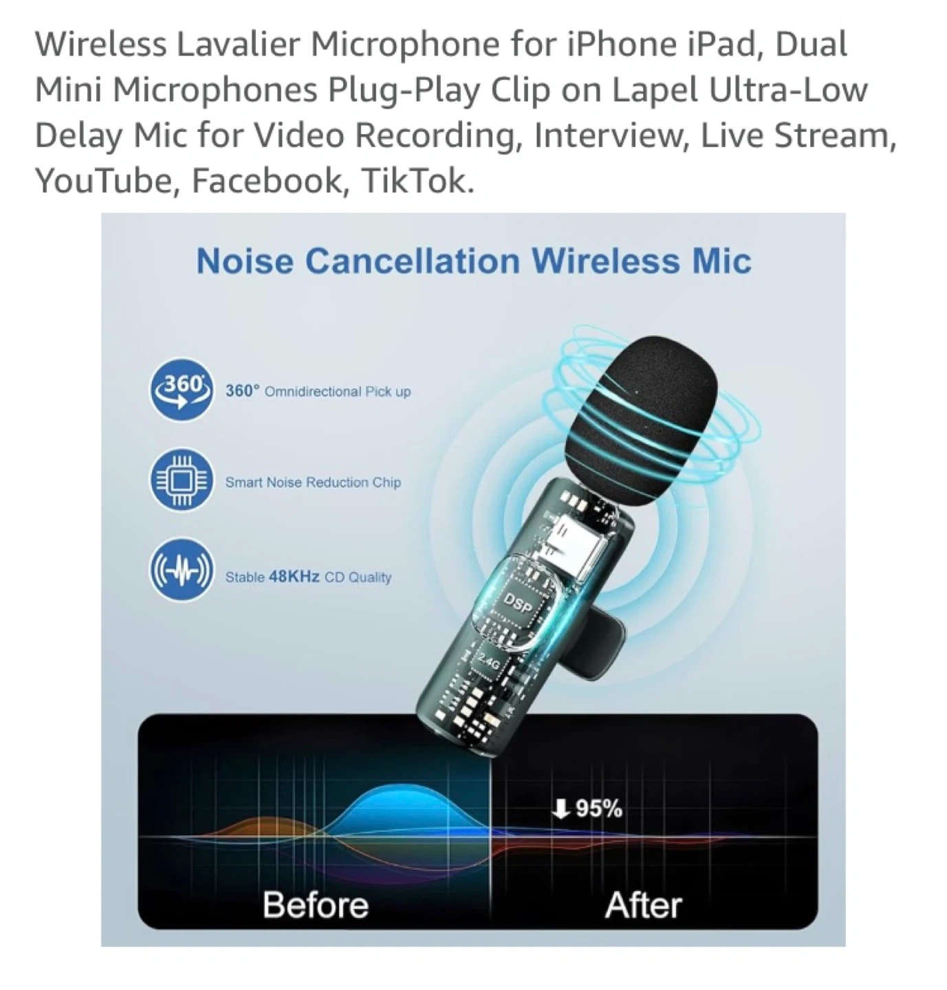 Brand New YIDEING wireless radio microphone set includes two clip-on mics and a receiver. It offers 6H working time with ultra-low latency and stable 48KHz CD quality sound. It's ideal for video recording and live streaming applications.