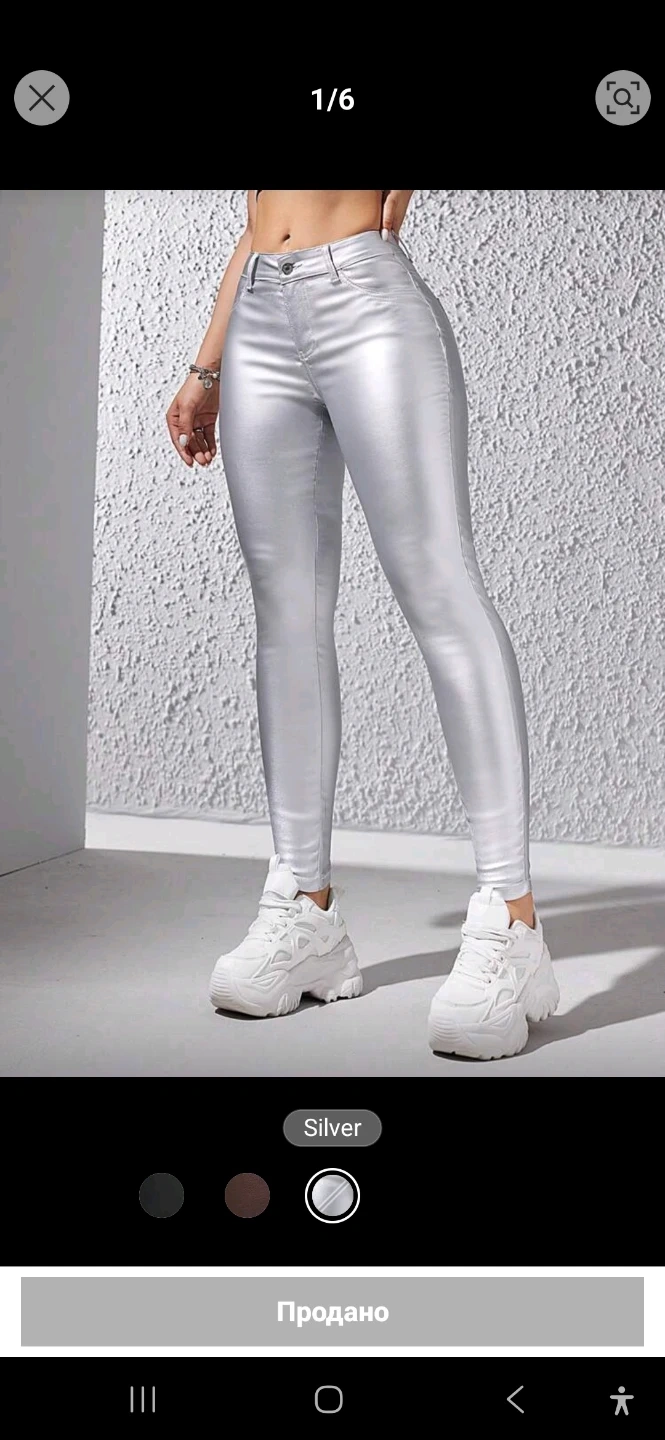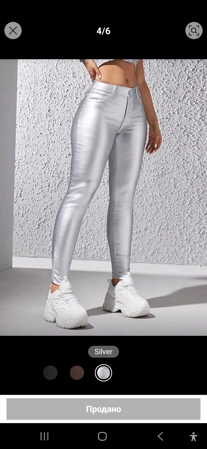 These high-waisted skinny pants are made from a shiny silver faux leather material. They feature a classic five-pocket design and a zip fly with button closure. The material offers a sleek, fitted look.