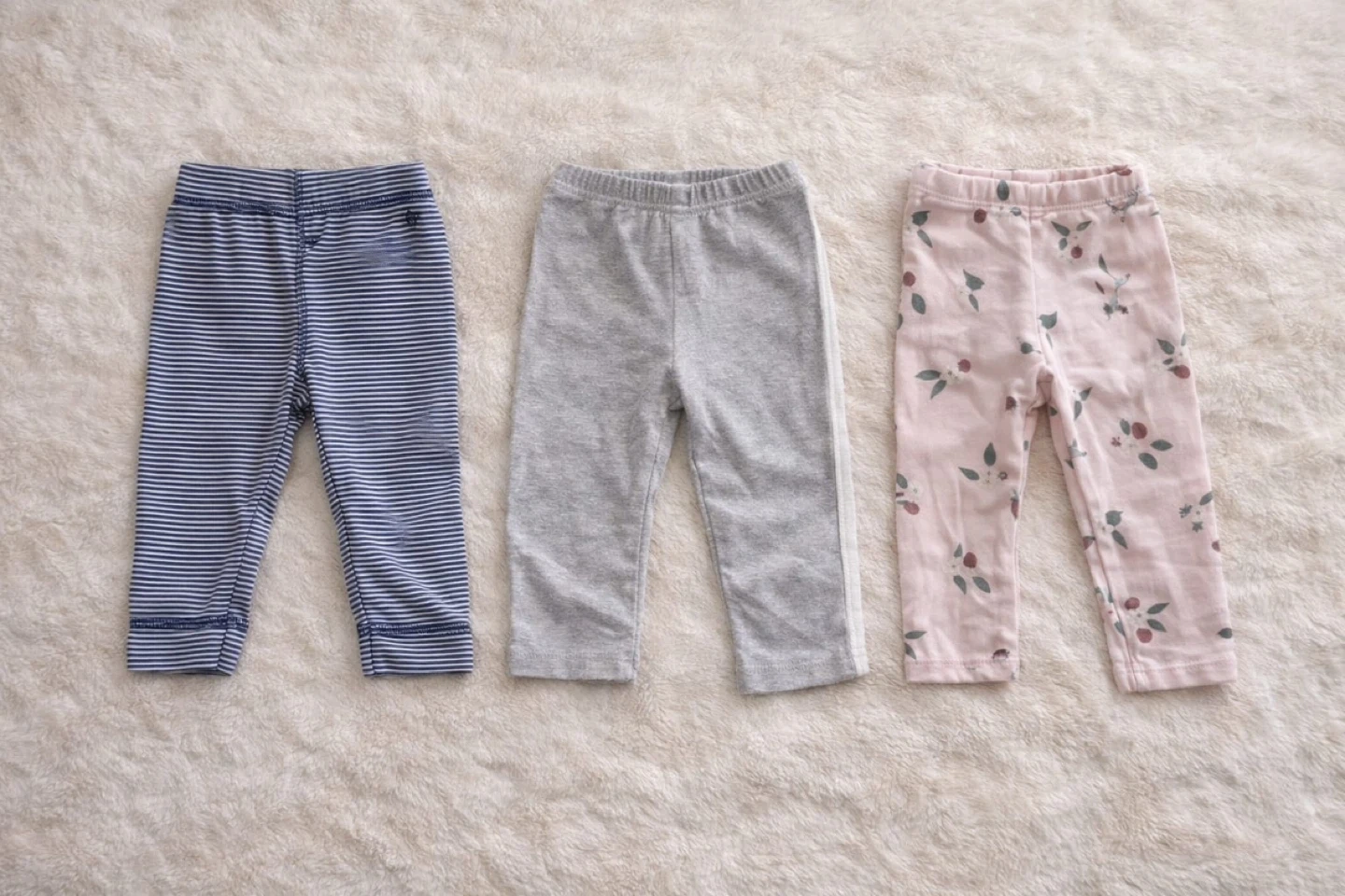 Three pairs of baby pants in various patterns. One pair features blue and white stripes, another is solid grey with a white stripe accent, and the third has a pink floral design. They're made of soft, breathable material for comfort. The age is for 3-6 months.