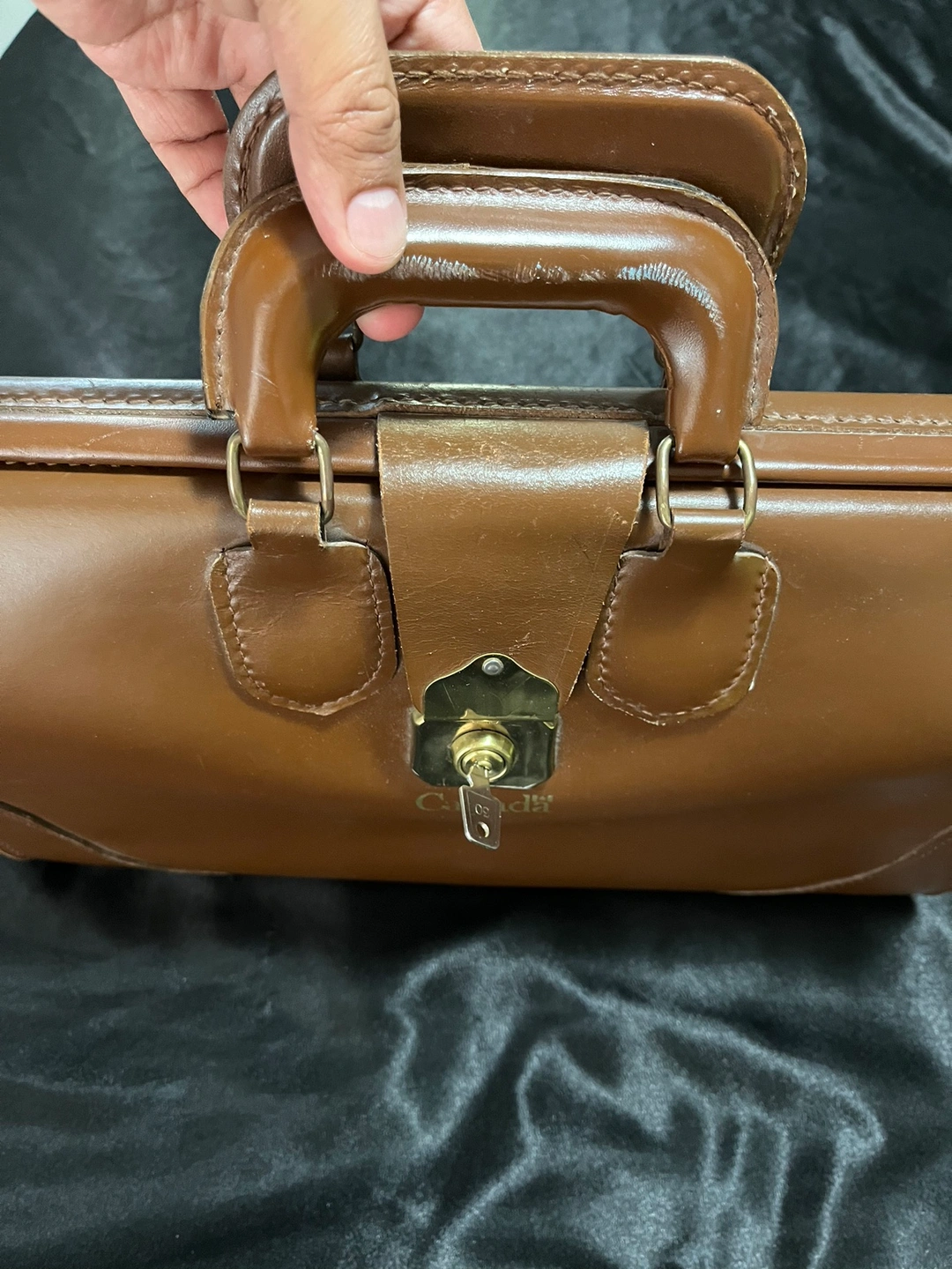 Brown leather briefcase with a lock and key. It has a gold "Canada" emblem on the front. The briefcase is in good condition.