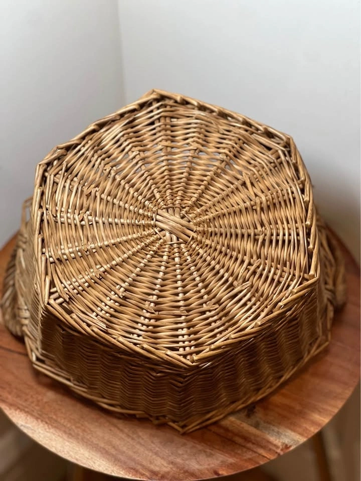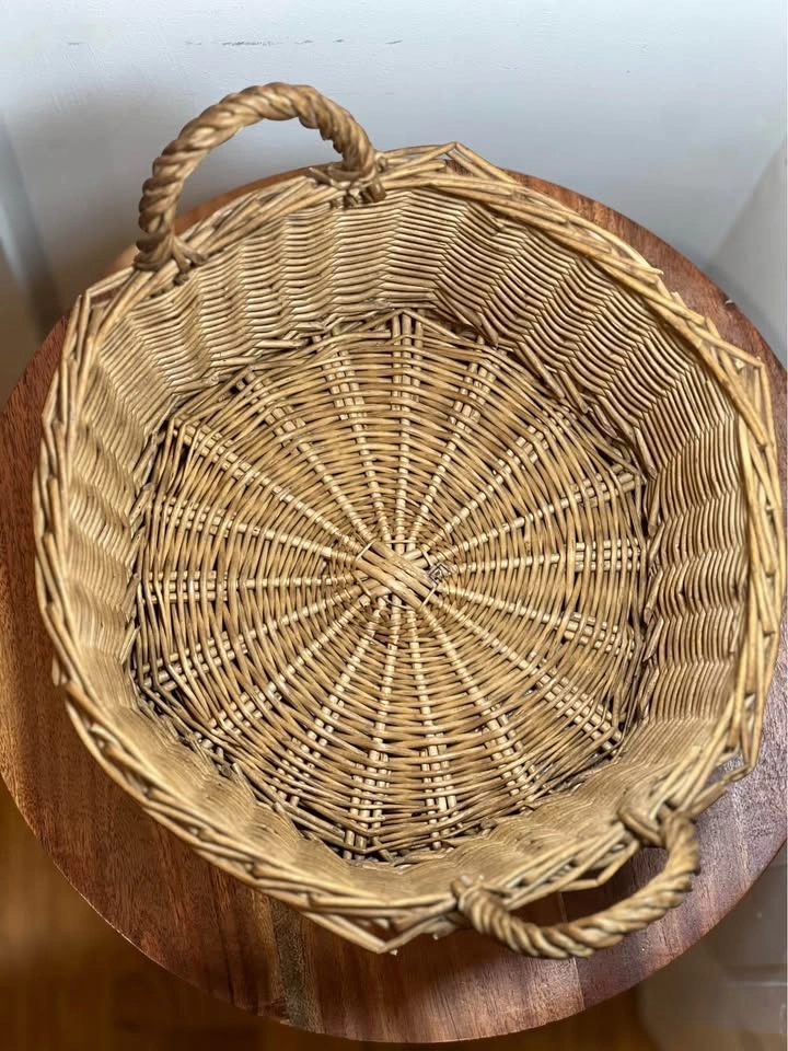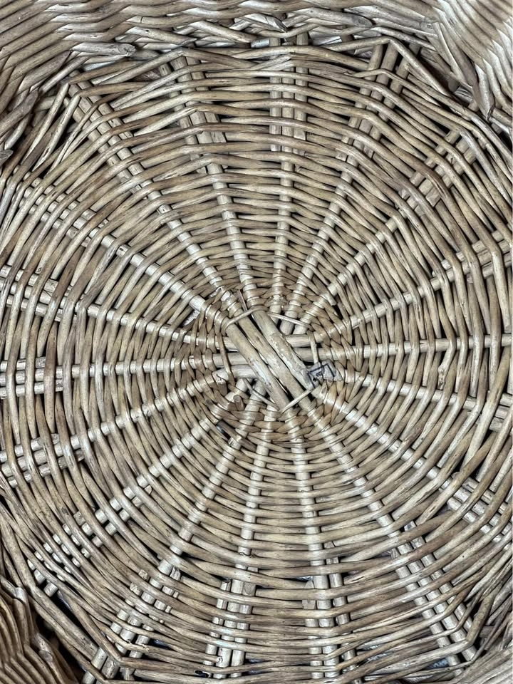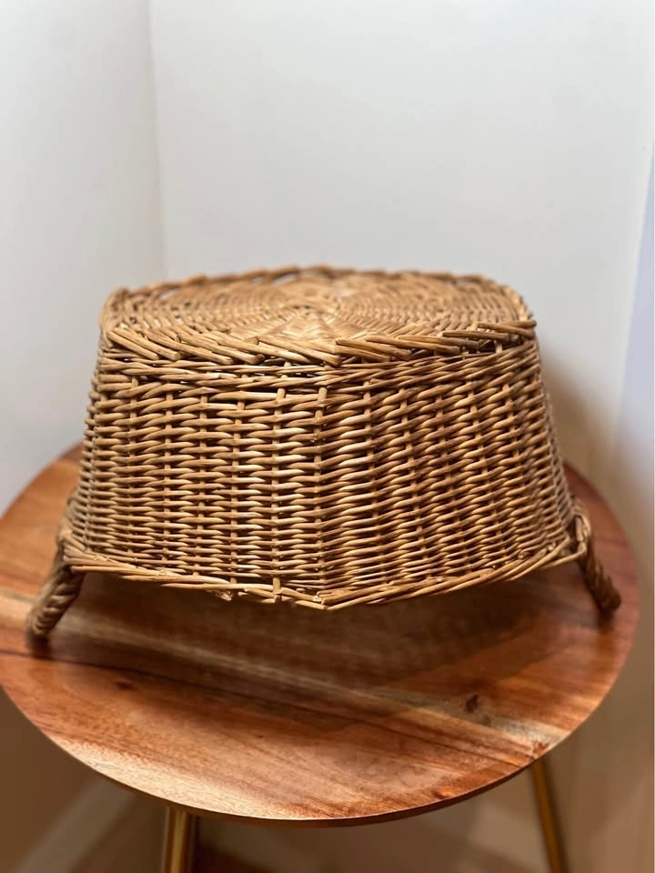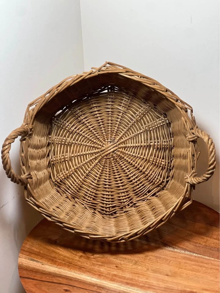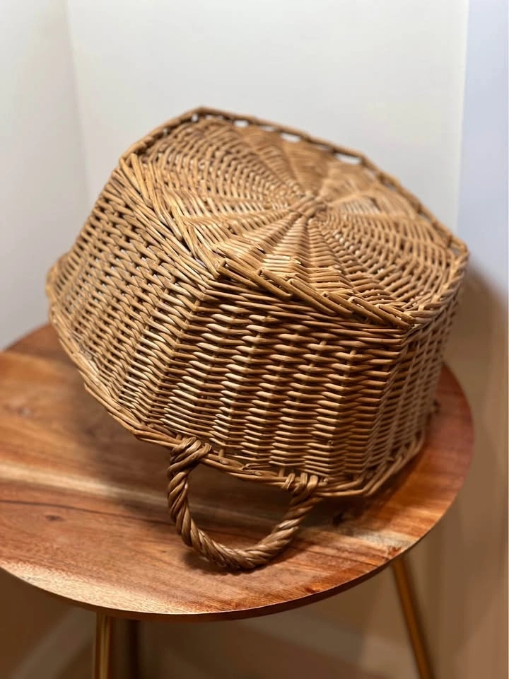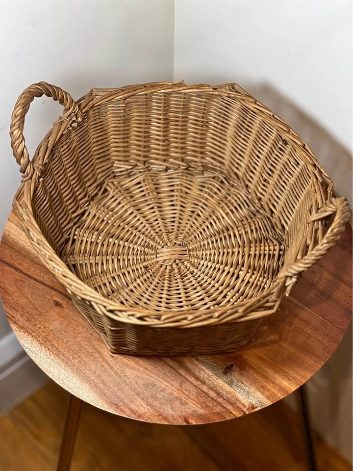 Charming woven wicker basket with sturdy side handles, perfect for both storage and décor. Features a unique slightly faceted shape and a tight, durable weave. Good overall condition with minor wear consistent with age, which adds to the rustic character. Structurally solid and ready to use. Pickup is 58th and 7th Ave in midtown Manhattan.
