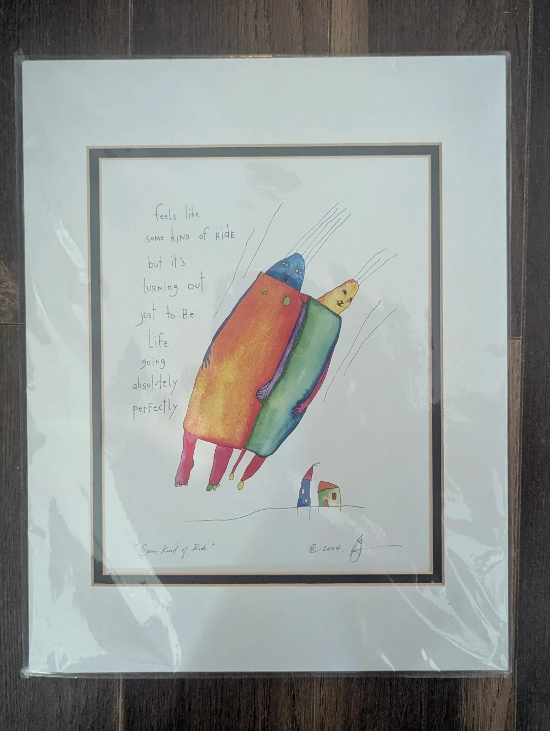 This print is a reproduction of a watercolor & ink drawing titled "Some Kind of Ride" by Brian Andreas. The artwork features two figures soaring through the sky. It's dated 2004.