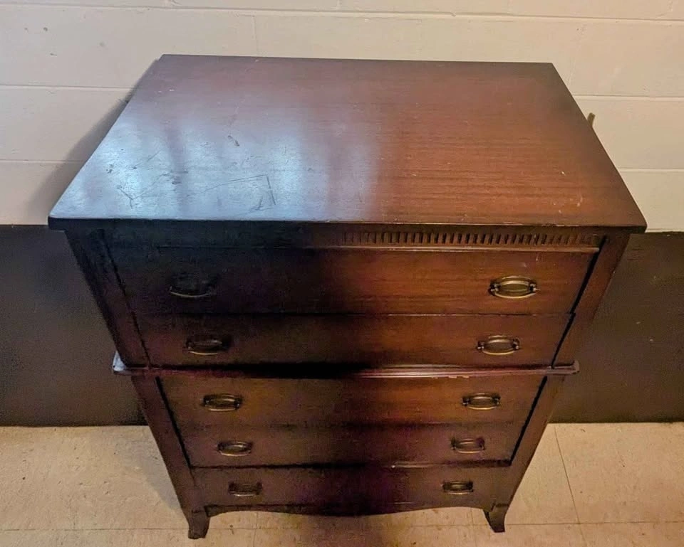 This dresser has a design style that aligns with Federal or Hepplewhite styles. It's typically made of mahogany or cherry wood and features oval brass pulls, a hallmark of Hepplewhite furniture. Pieces with this look are often associated with American furniture hubs like Grand Rapids. Dimensions: 34" W x 20" D x 47.75" H.
